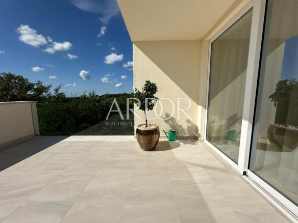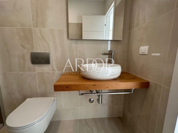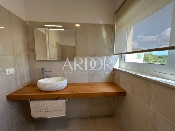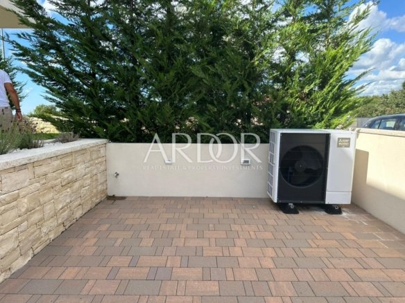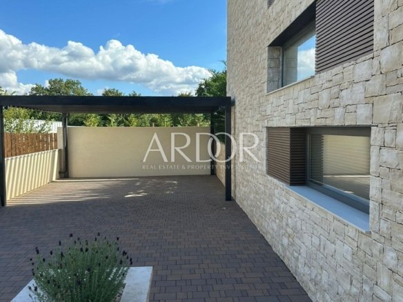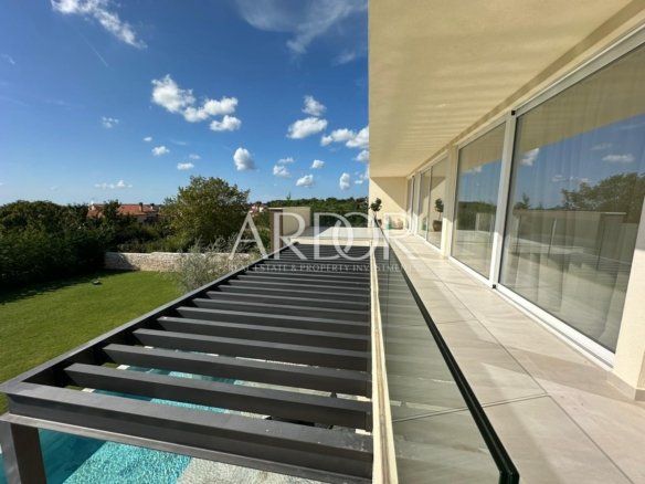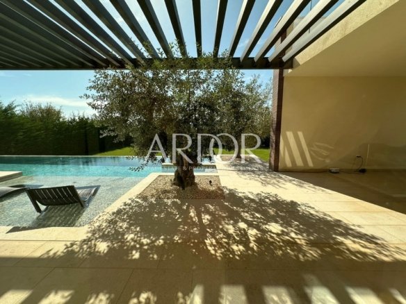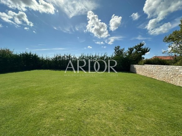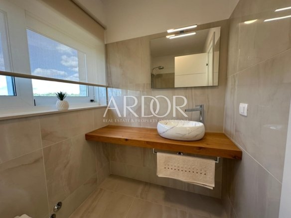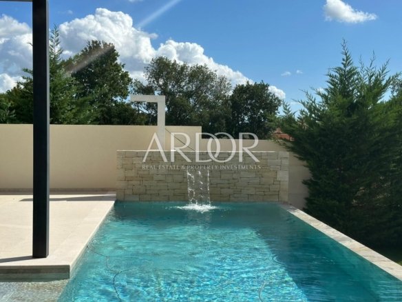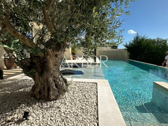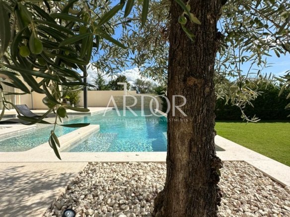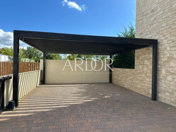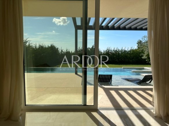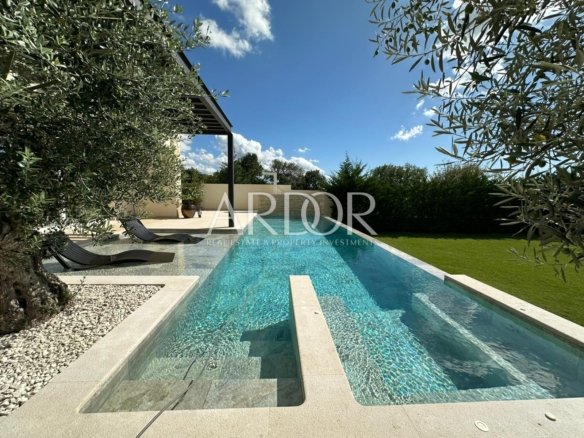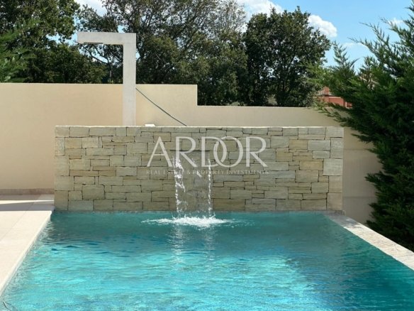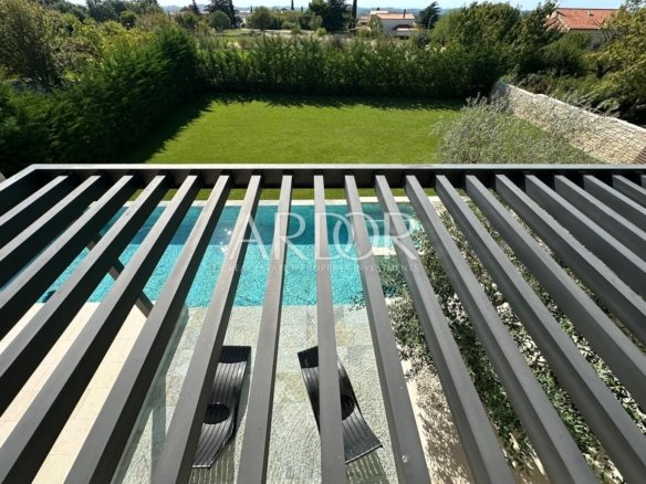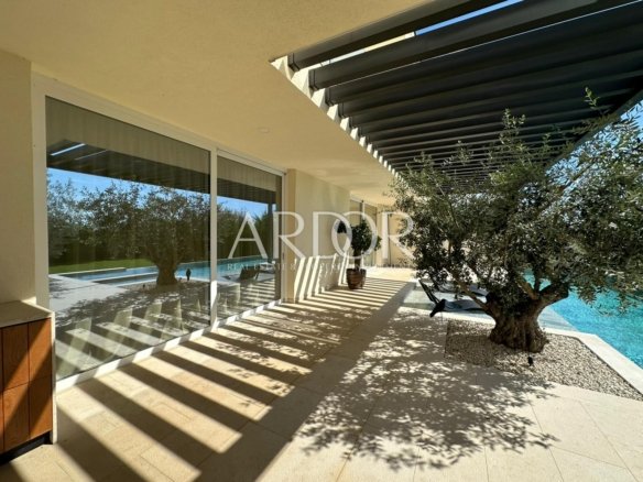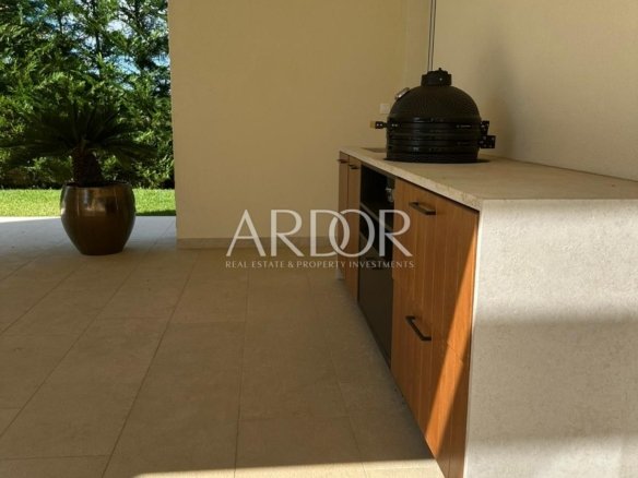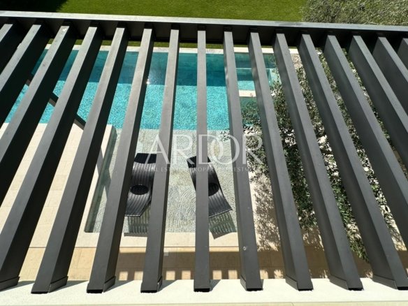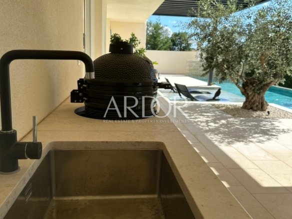 Vanjski prostor upotpunjuje preljevni grijani bazen sa slanom vodom i dizalicom topline, povezan sa smart aplikacijom kojom se temperatura može regulirati na daljinu. Tu je i vanjski tuš lokalnog dizajna, detalj koji naglašava luksuznu notu ove nekretnine. Automatski sustav navodnjavanja osigurava jednostavno održavanje travnjaka tijekom cijele godine.