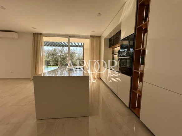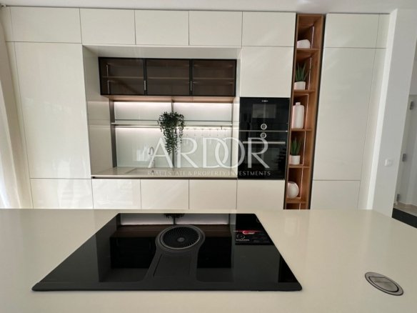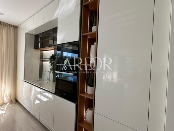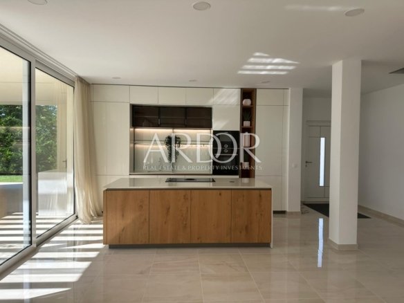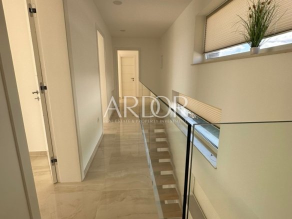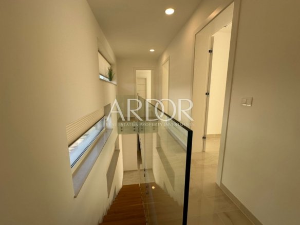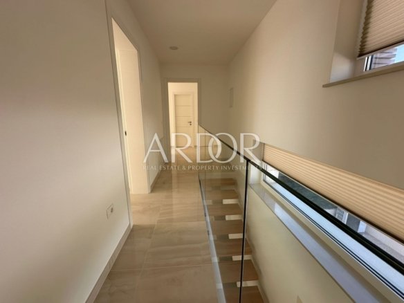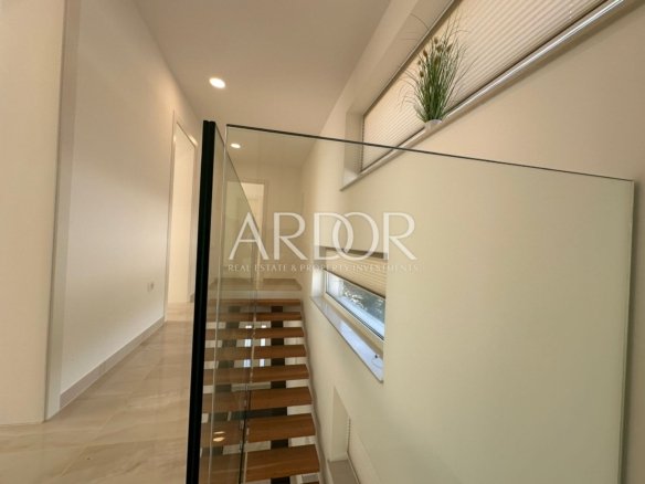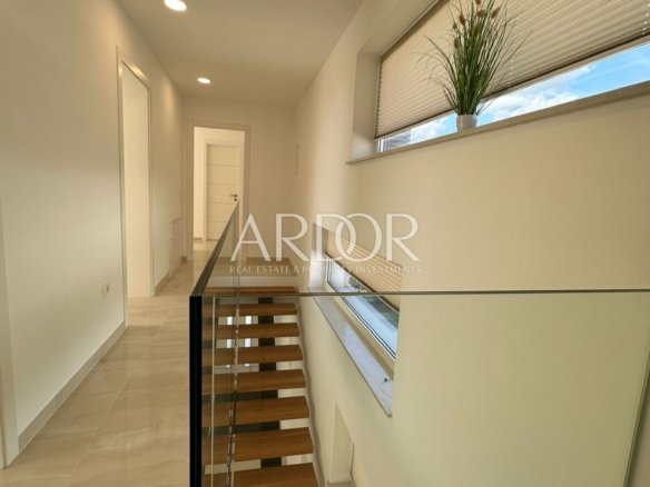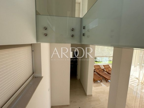 U prizemlju se nalazi otvoreni dnevni prostor koji spaja funkcionalnost i eleganciju, a poseban dojam ostavljaju drvene dizajnerske stepenice sa staklenim rukohvatom koje vode na kat. Na katu su smještene četiri spavaće sobe, svaka s vlastitom kupaonicom i izlazom na terasu. Kuhinja je dizajnerski projekt renomiranog brenda, potpuno prilagođena modernom načinu života.