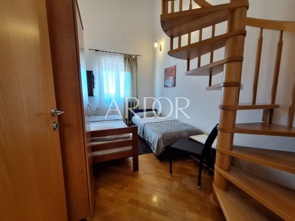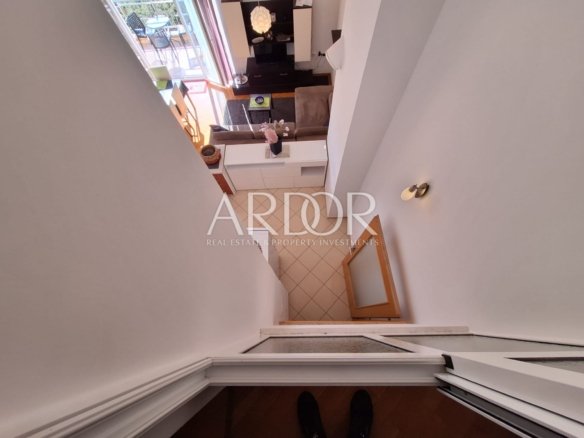 The apartment consists of two comfortable bedrooms and a third bedroom with internal stairs leading to an additional gallery space with a window and a view of the living room. This upper part can serve as a functional bedroom, work space or relaxation area, making the apartment extremely adaptable to different needs.