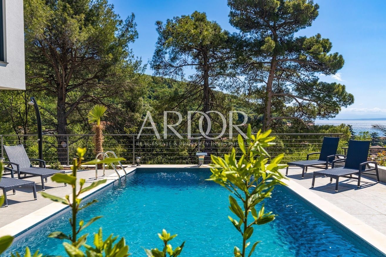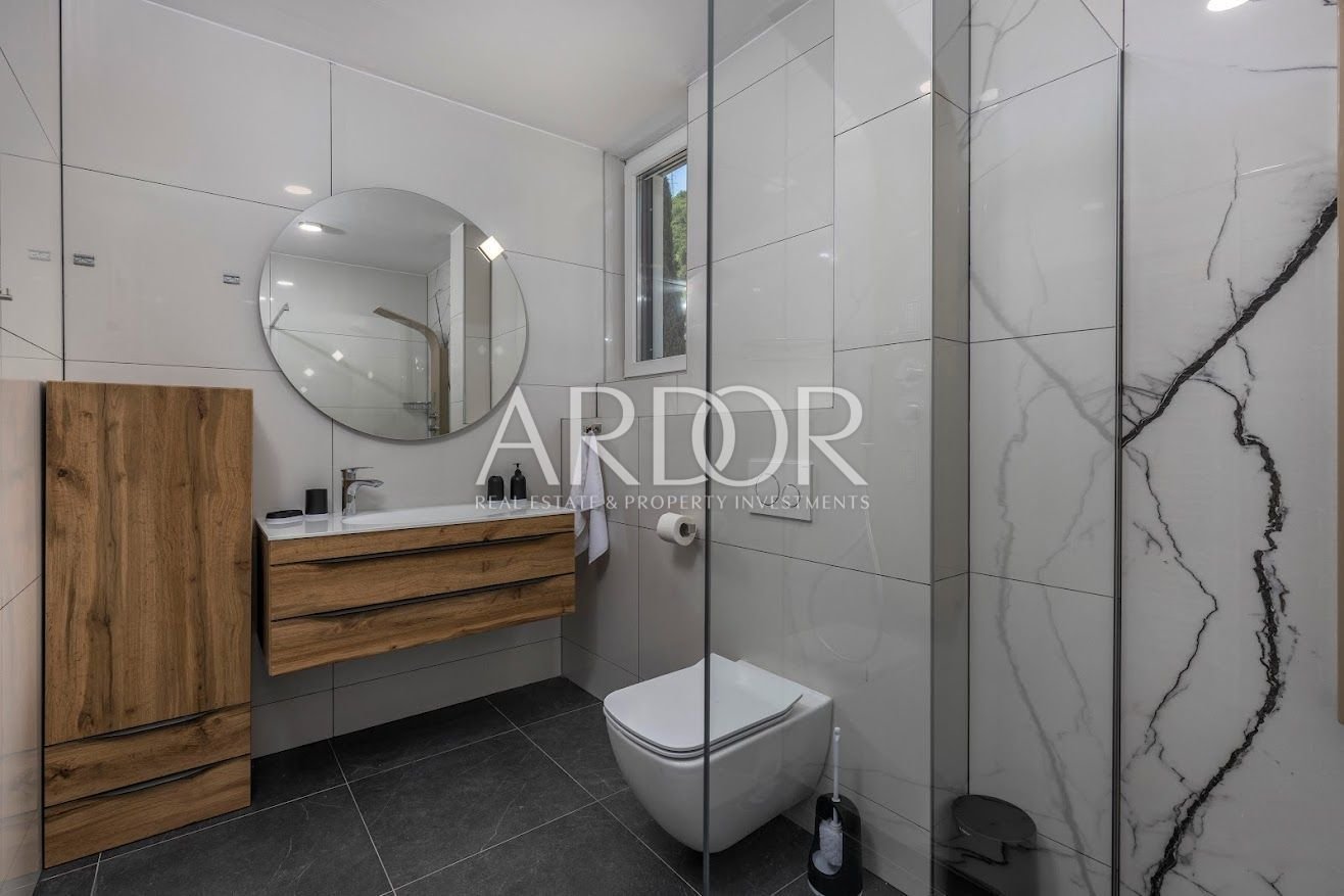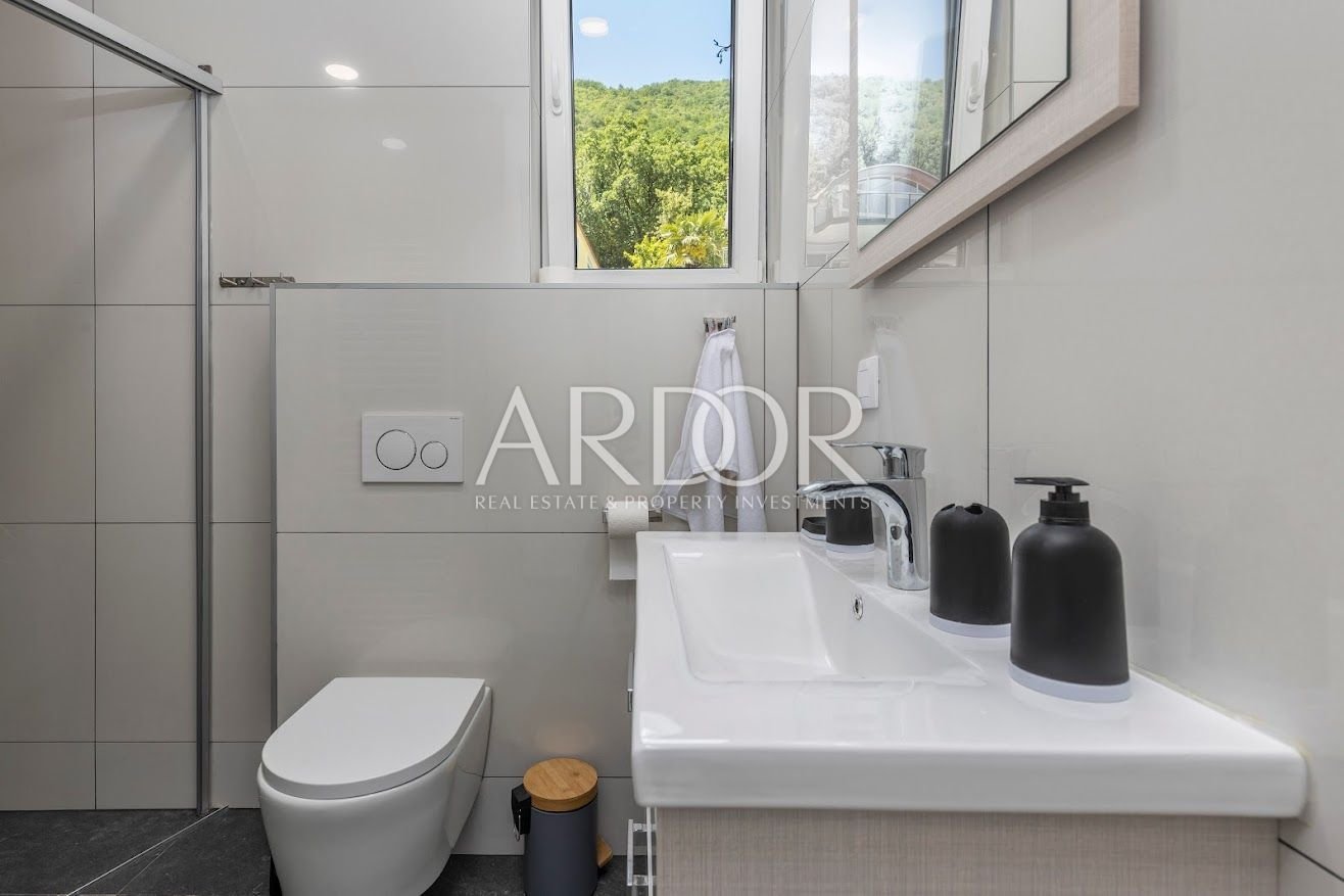 Na prodaju je novoizgrađena dvojna kuća - vila površine 201 m2, koja se nalazi u neposrednoj blizini Mošćeničke Drage. Ova vila čini dio kompleksa koji uključuje ukupno tri vile. Kuća se prostire na tri etaže: suteren, prizemlje i prvi kat. U suterenu se nalazi prostor za opuštanje i uživanje - wellness, te strojarnica za potrebe kuće i jedan toalet. Prizemlje je rezervirano za dnevni boravak, kuhinju, blagovaonicu i još jedan sanitarni čvor.Unutarnje stubište vodi na kat gdje se nalaze tri prostrane spavaće sobe, svaka sa svojom kupaonicom.Osim unutarnjeg prostora, kuća nudi i predivno uređenu okućnicu s bazenom veličine 36m2. S obzirom na povoljan položaj, s terase se pruža izvanredan pogled na more, te predivnu borovu šumu. Ova vila izgrađena je s naglaskom na visoki standard kvalitete, što jamči udoban i luksuzan život. Kuća je potpuno uređena i namještena, te opremljena modernim sigurnosnim sustavom videonadzora. Vila ima podno grijanje koje koristi Daikin sustav te klima uređaje u svim prostorijama. Ova nekretnina prodaje se u potpunosti opremljena namještajem, što znači da ćete odmah moći useliti i početi uživati u svom novom domu.