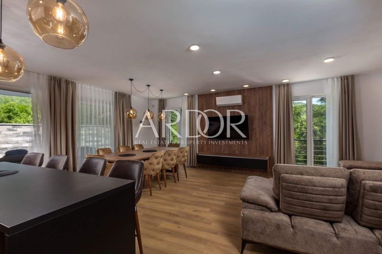 Wir haben in unserem Angebot ein neu gebautes Doppelhaus – eine Villa mit einer Fläche von 201 m2, in unmittelbarer Nähe von Mošćenička Draga. Diese Villa ist Teil eines Komplexes bestehend aus insgesamt drei Villen. Das Haus erstreckt sich über drei Etagen: Keller, Erdgeschoss und erster Stock. Im Keller gibt es einen Raum für Entspannung und Unterhaltung – Wohlbefinden, sowie einen Maschinenraum für den Haushaltsbedarf und ein Badezimmer. Das Erdgeschoss ist für Wohnzimmer, Küche, Esszimmer und ein weiteres Badezimmer reserviert. Eine Innentreppe führt in den ersten Stock, wo sich drei geräumige Schlafzimmer mit jeweils eigenem Bad befinden. Zusätzlich zum Innenraum bietet das Haus auch einen wunderschön angelegten Garten mit einem 36 m² großen Swimmingpool. Dank ihrer günstigen Lage bietet die Terrasse einen außergewöhnlichen Blick auf das Meer und den wunderschönen Pinienwald. Beim Bau dieser Villa wurde Wert auf einen hohen Qualitätsstandard gelegt, der ein komfortables und luxuriöses Wohnen gewährleistet. Das Haus ist komplett dekoriert und möbliert und mit einem modernen Videoüberwachungssystem ausgestattet. Die Villa verfügt über eine Fußbodenheizung mit dem Daikin-System und Klimaanlagen in allen Räumen. Diese Immobilie wird komplett möbliert verkauft, sodass Sie sofort einziehen und Ihr neues Zuhause genießen können.