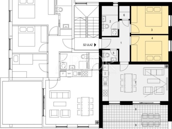 Apartma S1 se nahaja v 1. nadstropju in obsega: hodnik, kopalnico, spalnico 1, spalnico 2, WC, shrambo, kuhinjo/jedilnico/dnevno sobo, ložo, pokrito teraso, parkirno mesto 1, parkirno mesto 2
