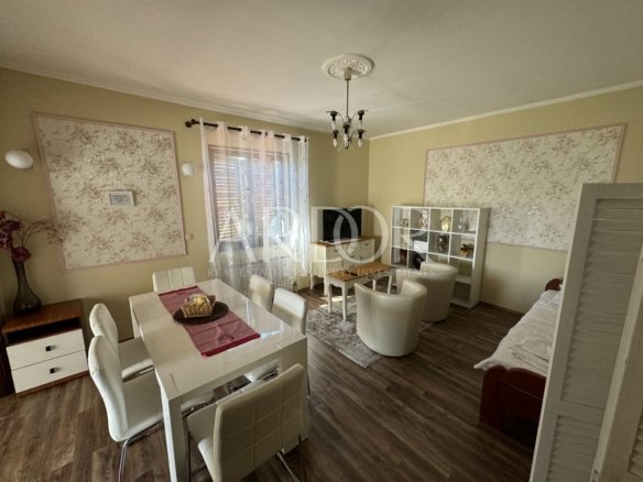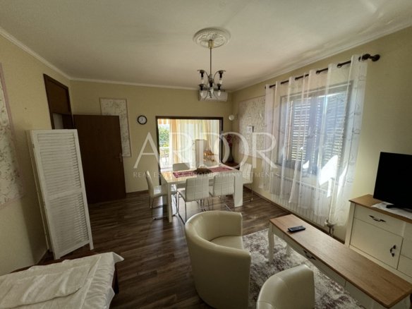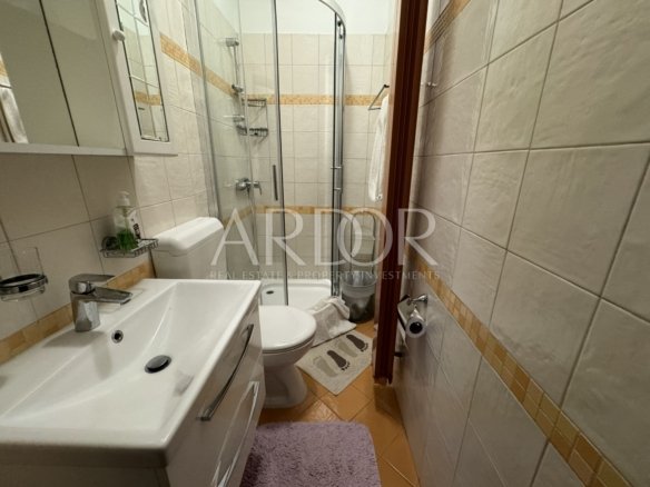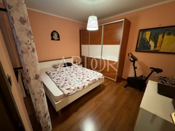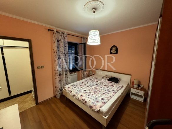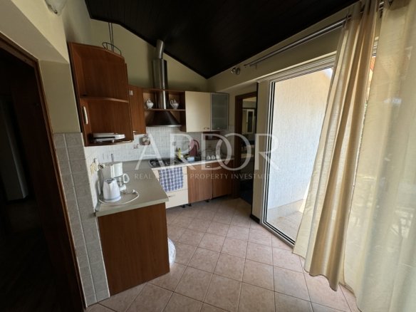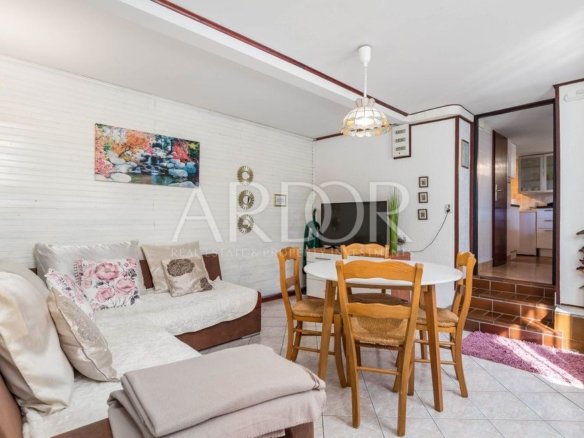 • Stan u prizemlju ima površinu od 102 m² i sastoji se od dvije spavaće sobe, dnevnog boravka, hodnika, dvije kupaonice, kuhinje i spremišta. Pripada mu djelomično natkrivena terasa i okućnica površine oko 50 m².
