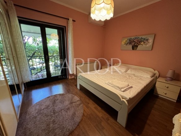 • The ground floor apartment has an area of 102 m² and consists of two bedrooms, living room, hallway, two bathrooms, kitchen, and storage room. It has a partially covered terrace and a garden area of about 50 m².