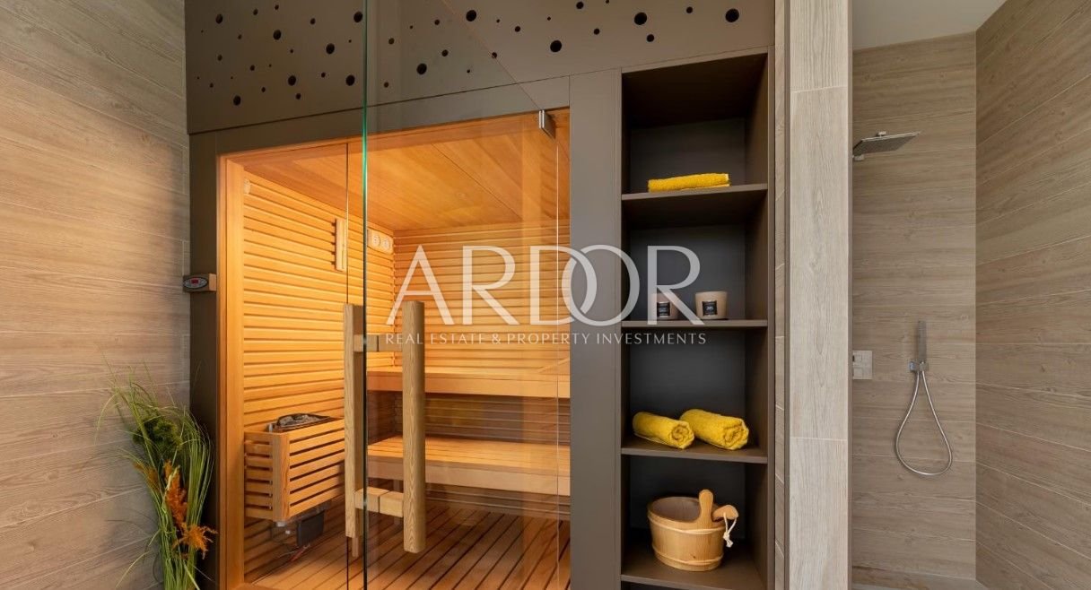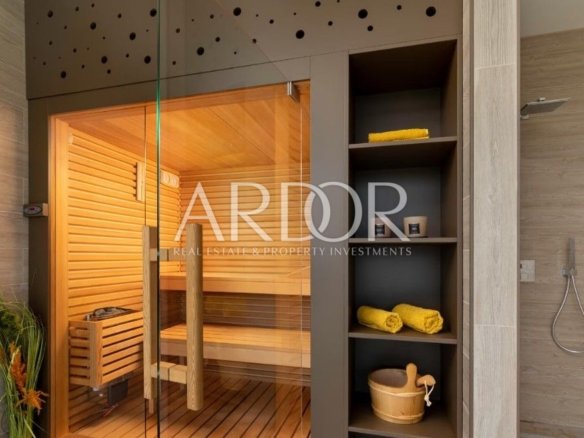 U prizemlju se nalazi prostrani dnevni boravak s blagovaonicom i potpuno opremljena kuhinja Scavolini s Miele uređajima. Osim toga, prizemlje uključuje gostinjski toalet i privatnu wellness zonu sa saunom, a iz svih prostorija omogućen je direktan izlaz u uređeno dvorište s grijanim infinity bazenom i sunčalištem.