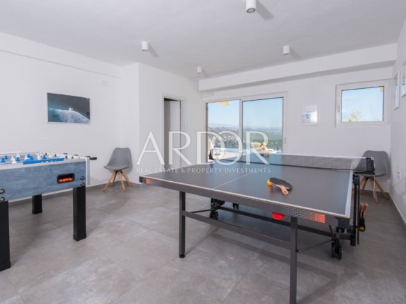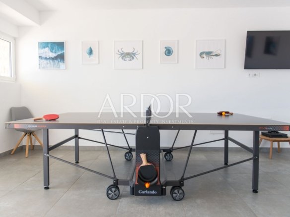 Vanjski sadržaji osmišljeni su za potpuno uživanje u slobodnom vremenu – veliki infinity grijani bazen, natkrivena terasa idealna za druženja, te jacuzzi koji osigurava opuštanje u svako doba dana. Za zabavu tu su i igraonica sa stolnim tenisom te stolni nogomet, smješteni u zatvorenom prostoru.