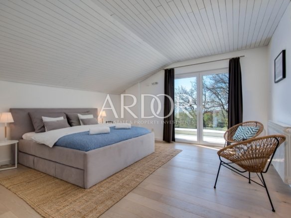 Vila ima štiri prostorne spalnice, vsaka z moderno opremljeno lastno kopalnico, kar zagotavlja popolno udobje in zasebnost. Kuhinja je vrhunsko opremljena in idealna za najzahtevnejše kulinarične navdušence.