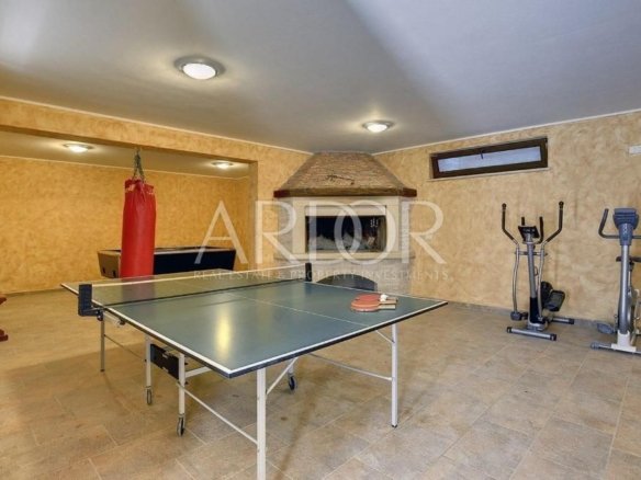 V pritličju je moderno opremljena kuhinja z jedilnico in prostorna, okusno opremljena dnevna soba, ki izžareva toplino in slog. Na voljo je tudi pralnica z vso opremo za pranje in likanje perila. Za zabavo in sprostitev v spodnji etaži sta biljard in namizni tenis.