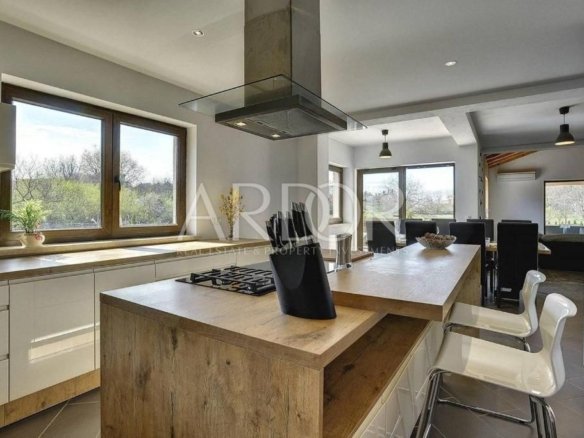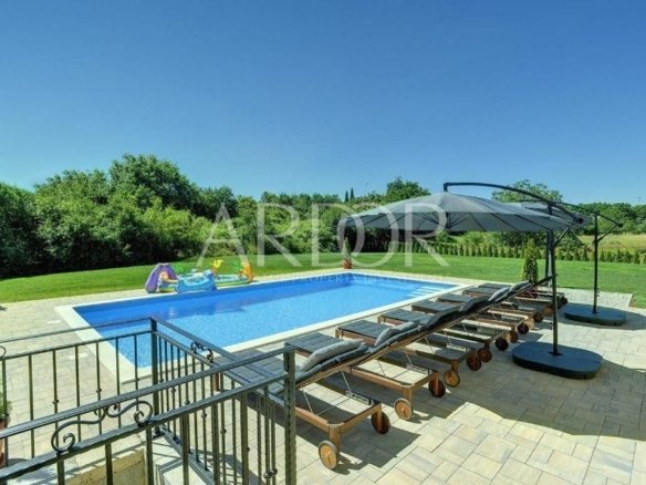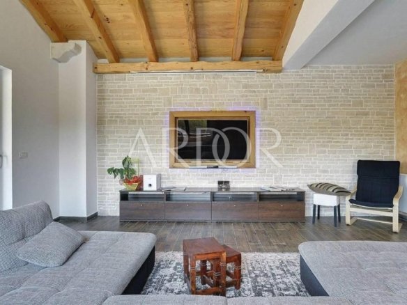 Die Villa fügt sich perfekt in die istrische Umgebung ein und verbindet rustikale Details mit modernem Design. Im Außenbereich befindet sich ein 54 m² großer Pool mit bequemen Sonnenliegen – ideal zum Sonnenbaden. Genießen Sie den Schatten unter der Pergola oder bereiten Sie kulinarische Köstlichkeiten in der Außenküche zu – perfekt für Mahlzeiten und geselliges Beisammensein auf der überdachten Terrasse.