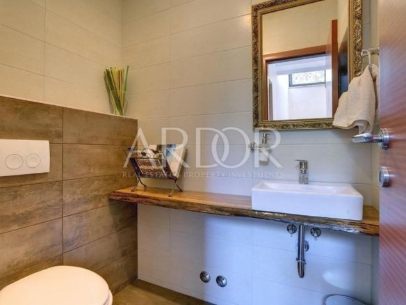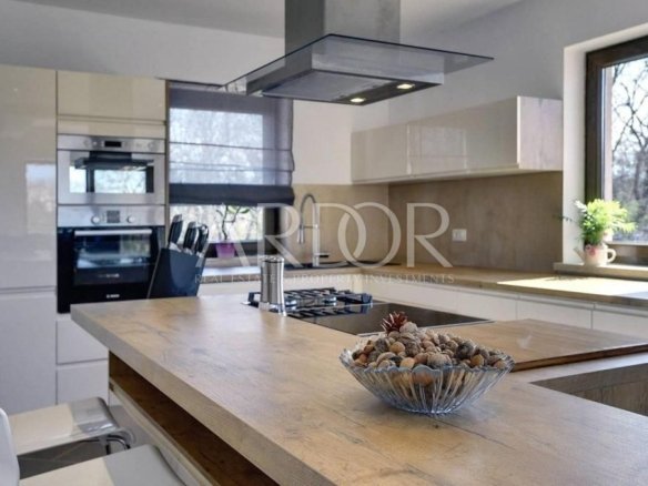 U prizemlju se nalazi moderno opremljena kuhinja s blagovaonicom te prostrani i ukusno uređen dnevni boravak koji odiše toplinom i stilom. Također, tu je i praonica s kompletnom opremom za pranje i glačanje rublja. Za zabavu i opuštanje na donjoj etaži nalaze se biljar i stolni tenis.