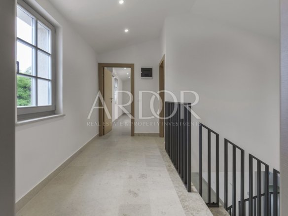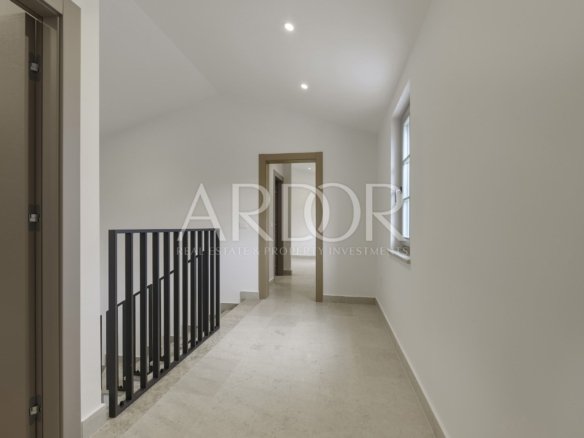 V prvním patře, které je přístupné po vnitřních schodech, jsou tři prostorné ložnice, každá s vlastní moderně řešenou koupelnou. Tradiční fasáda domu se zde dokonale snoubí s moderním interiérem, který nese punc designu. Stavební kvalita tohoto domu je bezvadná, ústřední podlahové vytápění s tepelnými čerpadly, klimatizace ve všech místnostech, kvalitní izolace a hliníkové truhlářství se sklem plněným argonem, výsledkem je energetický certifikát A+.