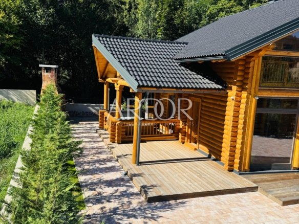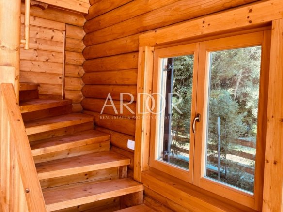 Im Erdgeschoss befinden sich ein Wohnzimmer, eine Küche, ein Esszimmer, ein Schlafzimmer, ein Badezimmer mit Sauna, zwei Terrassen (eine vom Wohn-/Esszimmer, die zweite Terrasse mit Whirlpool und Ausgang vom Badezimmer) und eine Toilette.