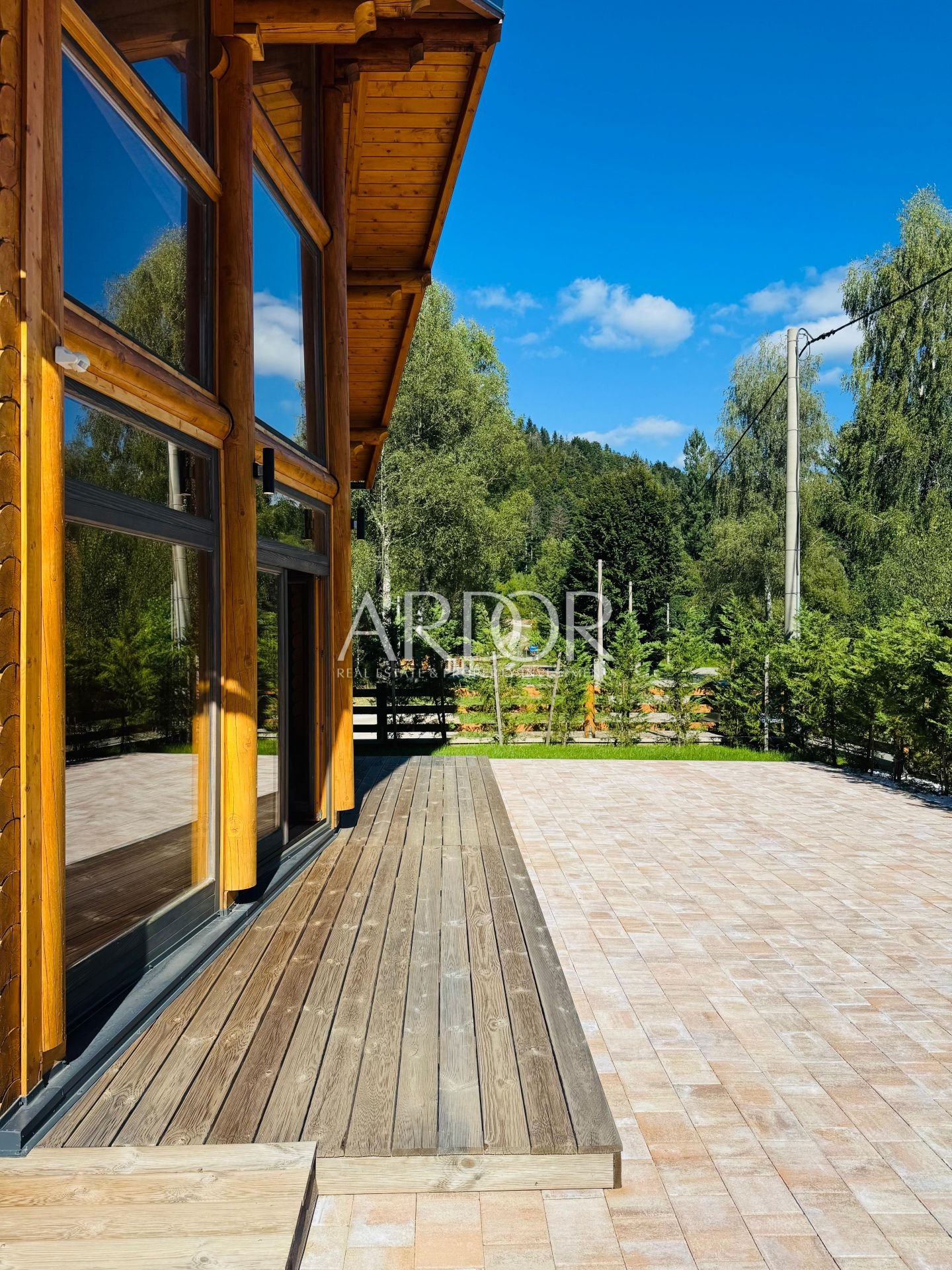 Im Erdgeschoss befinden sich ein Wohnzimmer, eine Küche, ein Esszimmer, ein Schlafzimmer, ein Badezimmer mit Sauna, zwei Terrassen (eine vom Wohn-/Esszimmer aus und eine weitere mit Whirlpool, die vom Badezimmer aus zugänglich ist) und ein Badezimmer.
