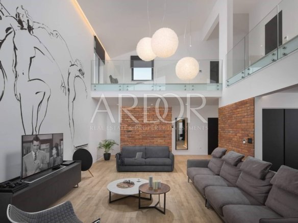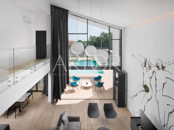 Istrien, Ližnjan, eine wunderschöne 400 m2 große Villa mit einem 900 m2 großen Garten zu verkaufen. Das Konzept der Villa besteht und darin, das Atrium über Brücken zu durchqueren. Die restlichen drei Stockwerke sind Keller, Erdgeschoss und Dachgeschoss. Im Untergeschoss befindet sich ein Maschinenraum, WC und ein Unterhaltungsraum (Tischtennisplatte, Hausfahrrad). Im Erdgeschoss finden Sie eine geräumige, moderne Küche mit Essbereich, ein schönes Wohnzimmer, das die Möglichkeit absoluter Privatsphäre bietet, ein speziell für Menschen mit besonders befrenzieden gestalteten Schlafzimmern und einer Toilette.
