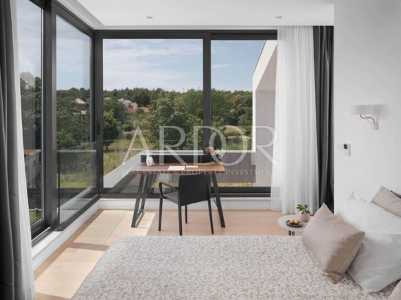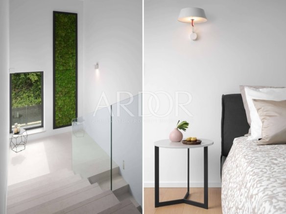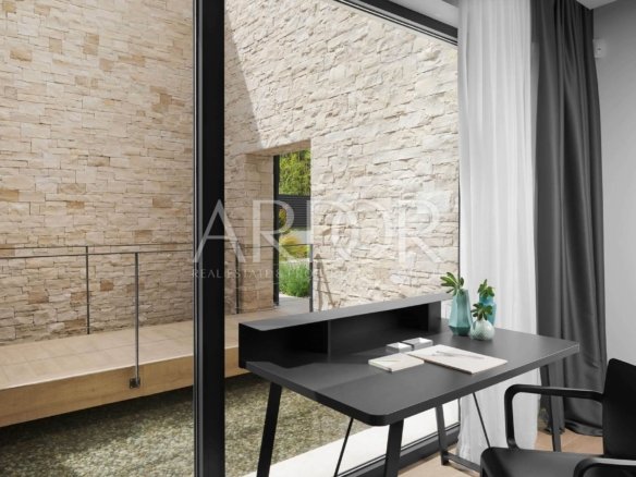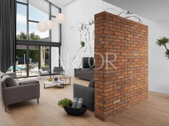 Istrien, Ližnjan, eine wunderschöne 400 m2 große Villa mit einem 900 m2 großen Garten zu verkaufen. Das Konzept der Villa sieht weiterhin die Verwendung von Brücken vor, um durch das Atrium zu gelangen. Die restlichen drei Stockwerke sind Keller, Erdgeschoss und Dachgeschoss. Im Keller befinden sich ein Maschinenraum, eine Toilette und ein Unterhaltungsraum (Tischtennisplatte, Hausfahrrad). Im Erdgeschoss finden Sie eine geräumige, moderne Küche mit Essbereich, ein schönes Wohnzimmer, das absolute Privatsphäre bietet, ein speziell für Menschen mit besonderen Bedürfnissen eingerichtetes Schlafzimmer und eine Toilette.