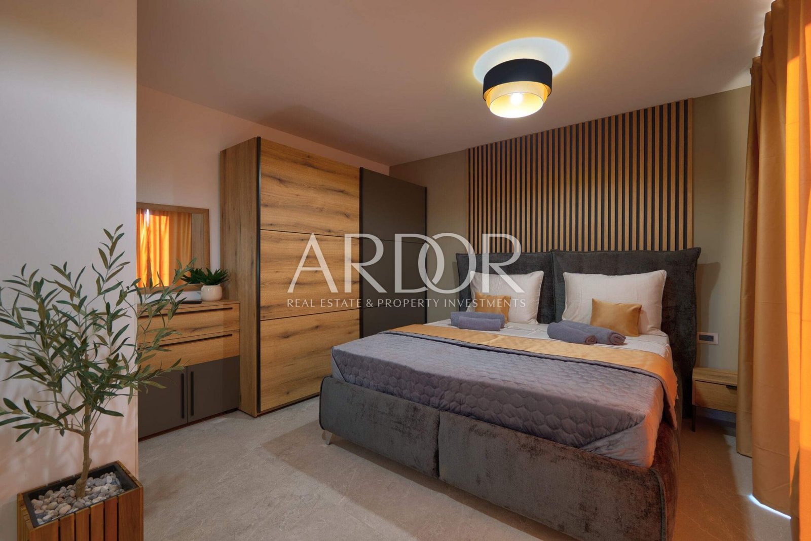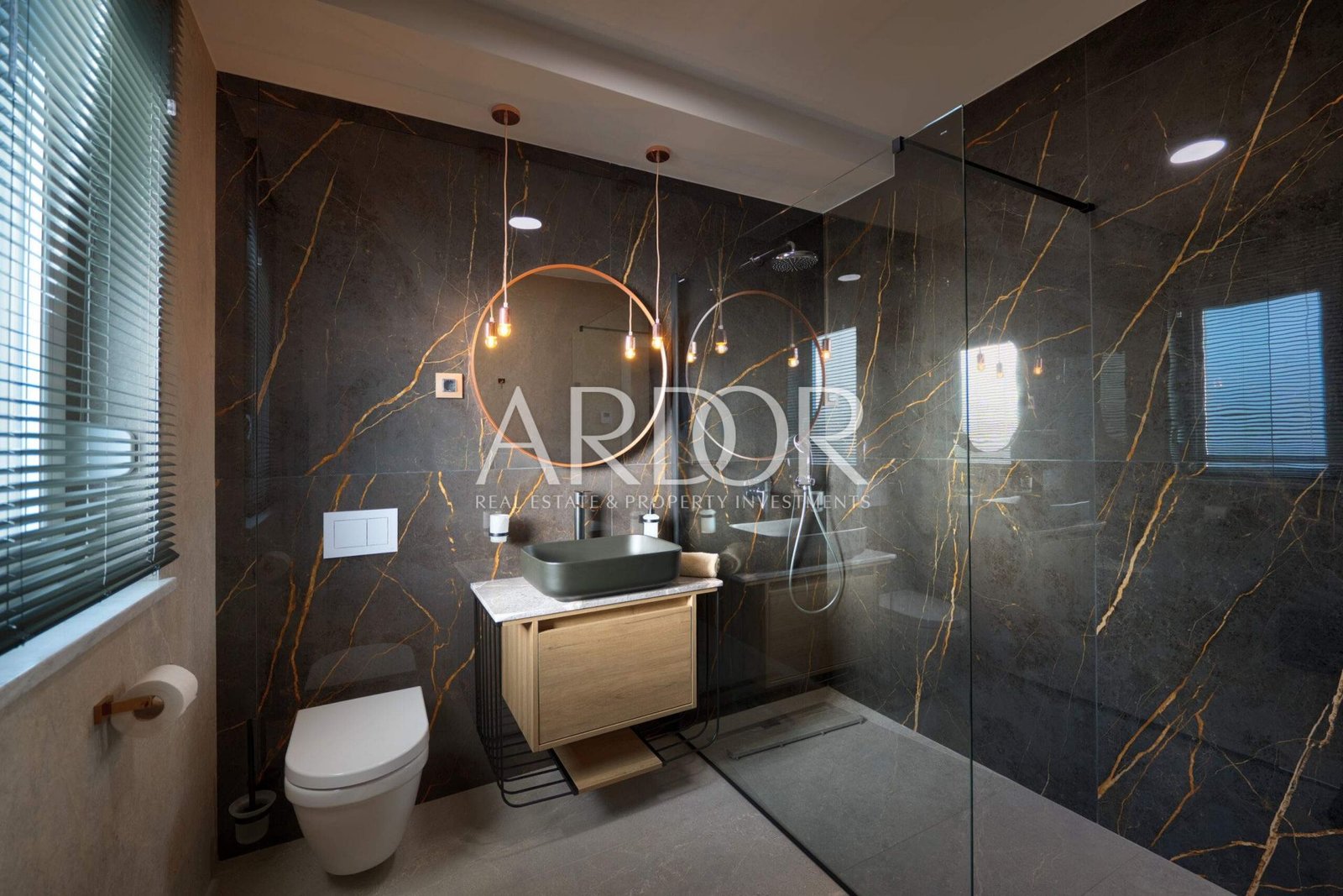 Unutrašnjost kuće odiše modernim luksuzom i toplinom doma. Središnji dio čini prostrani dnevni boravak povezan s elegantno uređenom kuhinjom i blagovaonicom, savršenim prostorom za druženje ili odmor. Vila ima četiri udobne spavaće sobe, svaka sa svojom vrhunski opremljenom kupaonicom, što omogućava potpunu privatnost i udobnost svim ukućanima i gostima. Dizajnerski detalji i pažljivo odabrani materijali stvaraju dojam sofisticiranosti i bezvremenskog stila.