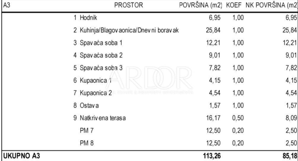 Apartman A3 nalazi se na 2. katu, a sastoji se od: hodnika, kuhinja/blagovaonica/dnevni boravak, spavaća soba 1, spavaća soba 2, spavaća soba 3, kupaonica 1, kupaonica 2, ostava, natkrivena terasa, parkirno mjesto 1, parkirno mjesto 2