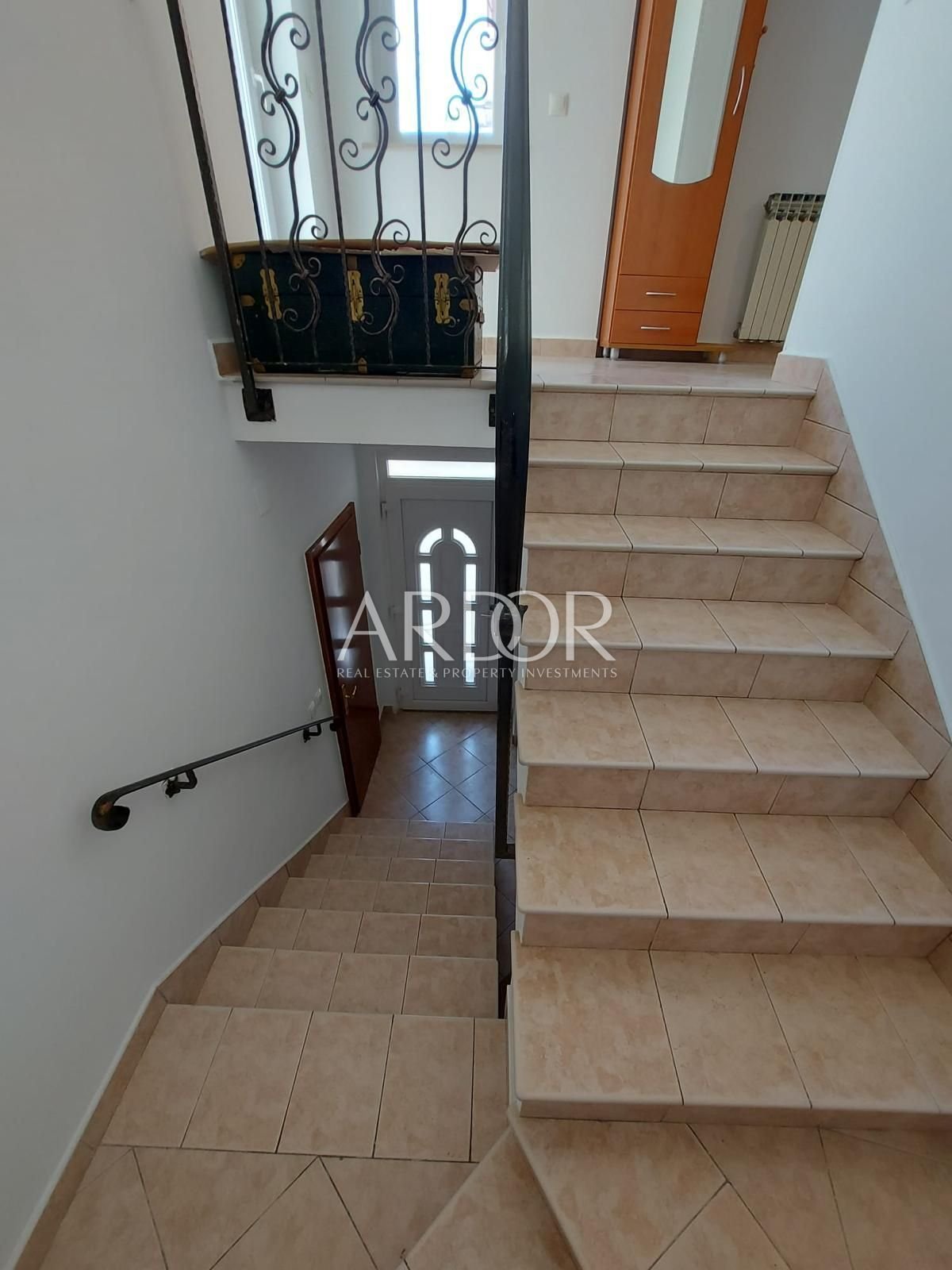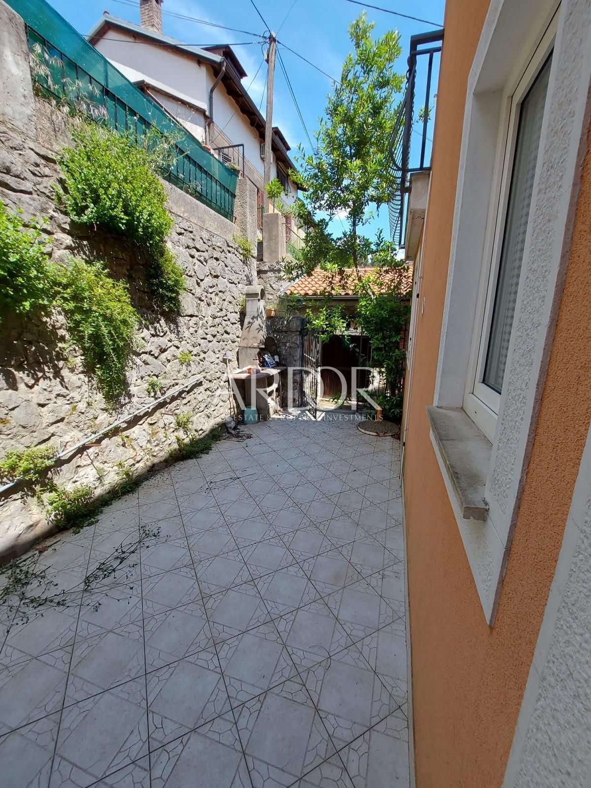 U prizemlju se nalazi prostrani jednosobni stan sa open space konceptom kuhinje, blagovaone i dnevnog boravka, ostave, zasebnog WC-a te velike kupaonice. Na prvom katu smješten je svijetli i sunčani stan koji se sastoji od ulaznog hodnika, spremišta, zasebnog WC-a, open space blagovaone i dnevnog boravka te jedne veće spavaće sobe. Po cijeloj dužini kuće proteže se balkon na koji se može izaći iz dnevnog boravka i spavaće sobe. Sa stražnje strane kuće možete uživati na skrivenoj od pogleda, uređenoj terasi od 30-tak m2 sa roštiljem. U visokom potkrovlju nalazi se dvosoban stan, sa kuhinjom, blagovaonom i dnevnim boravkom, kupaonicom, zasebnim WC-om te izlazom na balkon sa južne strane i na terasu sa sjeverne strane. Kuća ima 400 m2 ograđene okućnice, konobu, garažu površine 18 m2.