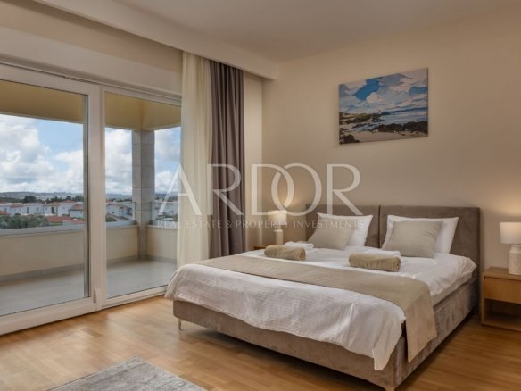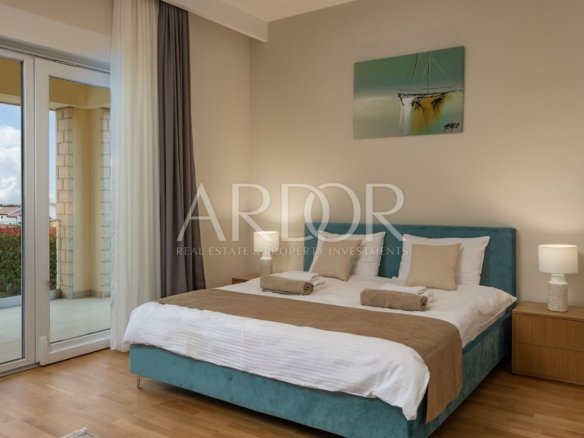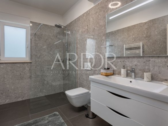 Na gornjoj etaži nalaze se tri spavaće sobe, svaka s privatnom kupaonicom i pristupom prostranoj terasi s panoramskim pogledom na more. Podrum služi kao funkcionalni prostor s garažom za dva automobila, vinskim podrumom i dodatnim prostorom za pohranu, sve temperaturno kontrolirano za optimalnu upotrebu.