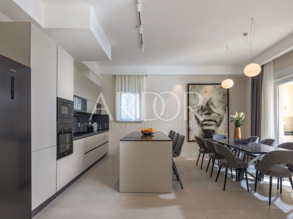 On the upper floor there are three bedrooms, each with a private bathroom and access to a spacious terrace with a panoramic view of the sea. The basement serves as a functional space with a two-car garage, wine cellar and additional storage space, all temperature controlled for optimal use.