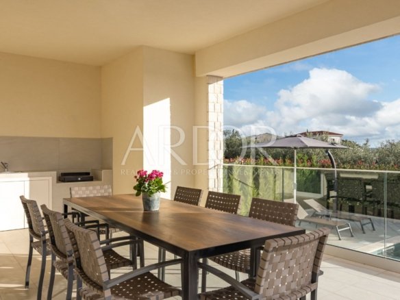 Prizemlje odlikuje prostranim dnevnim boravkom s blagovaonicom i kuhinjom, ostavom, gostinjskim WC-om i spavaćom sobom s vlastitom kupaonicom. Izlaz na prekrasnu terasu s ljetnom kuhinjom vodi do vrta s grijanim bazenom i vanjskim tušem. Okoliš se sastoji od dobro održavanog travnjaka s automatskim sustavom navodnjavanja te voćnjaka.