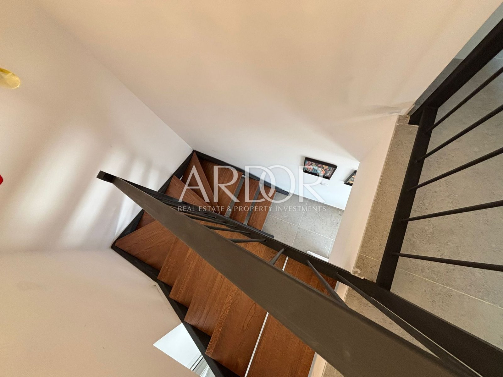 Stan se prostire na dvije etaže i funkcionalno je organiziran. Na donjoj etaži nalazi se otvoreni dnevni prostor koji povezuje kuhinju, blagovaonicu i dnevni boravak, uz kupaonicu s WC-om te unutarnje stepenište koje vodi na gornju etažu.