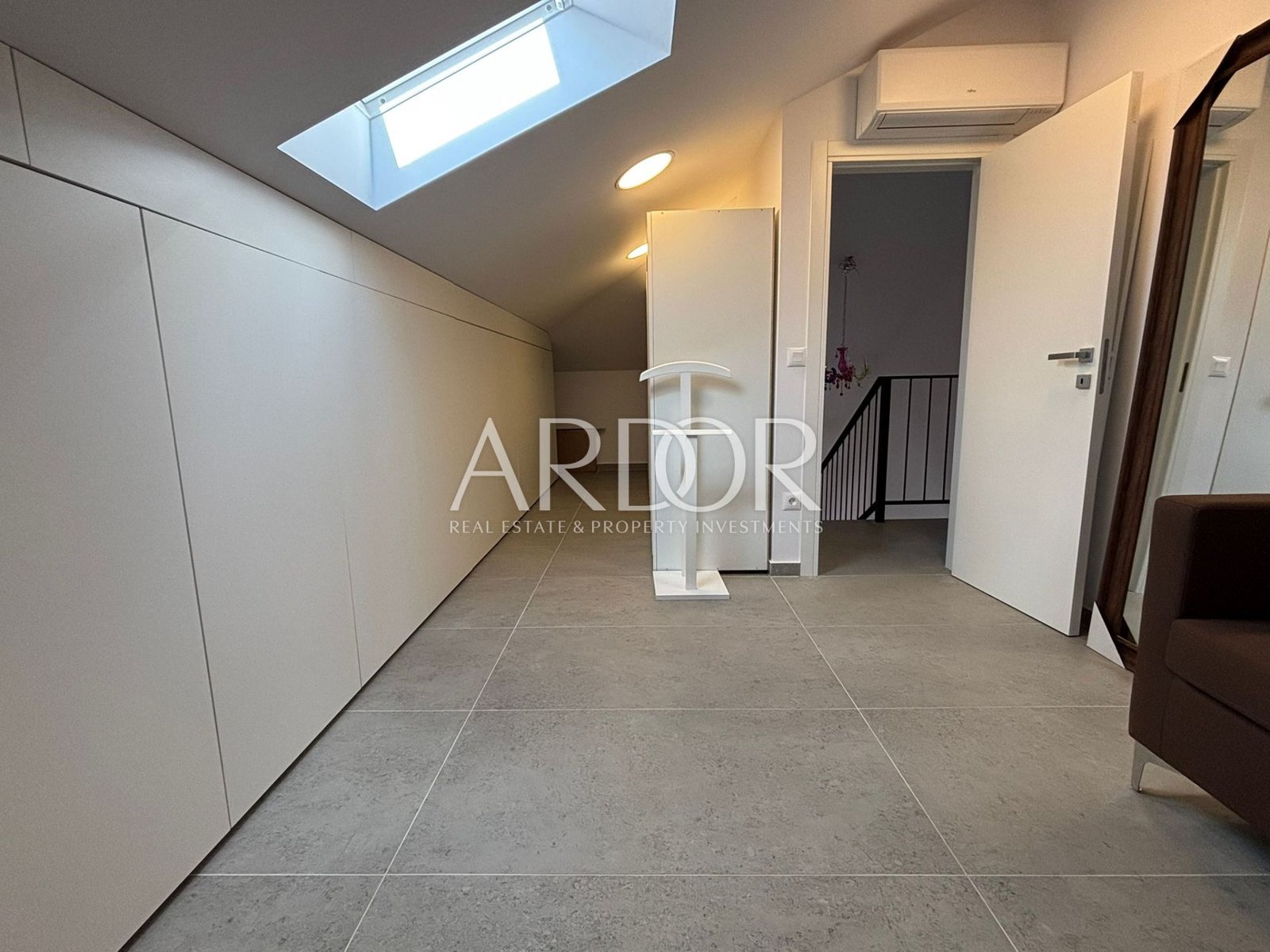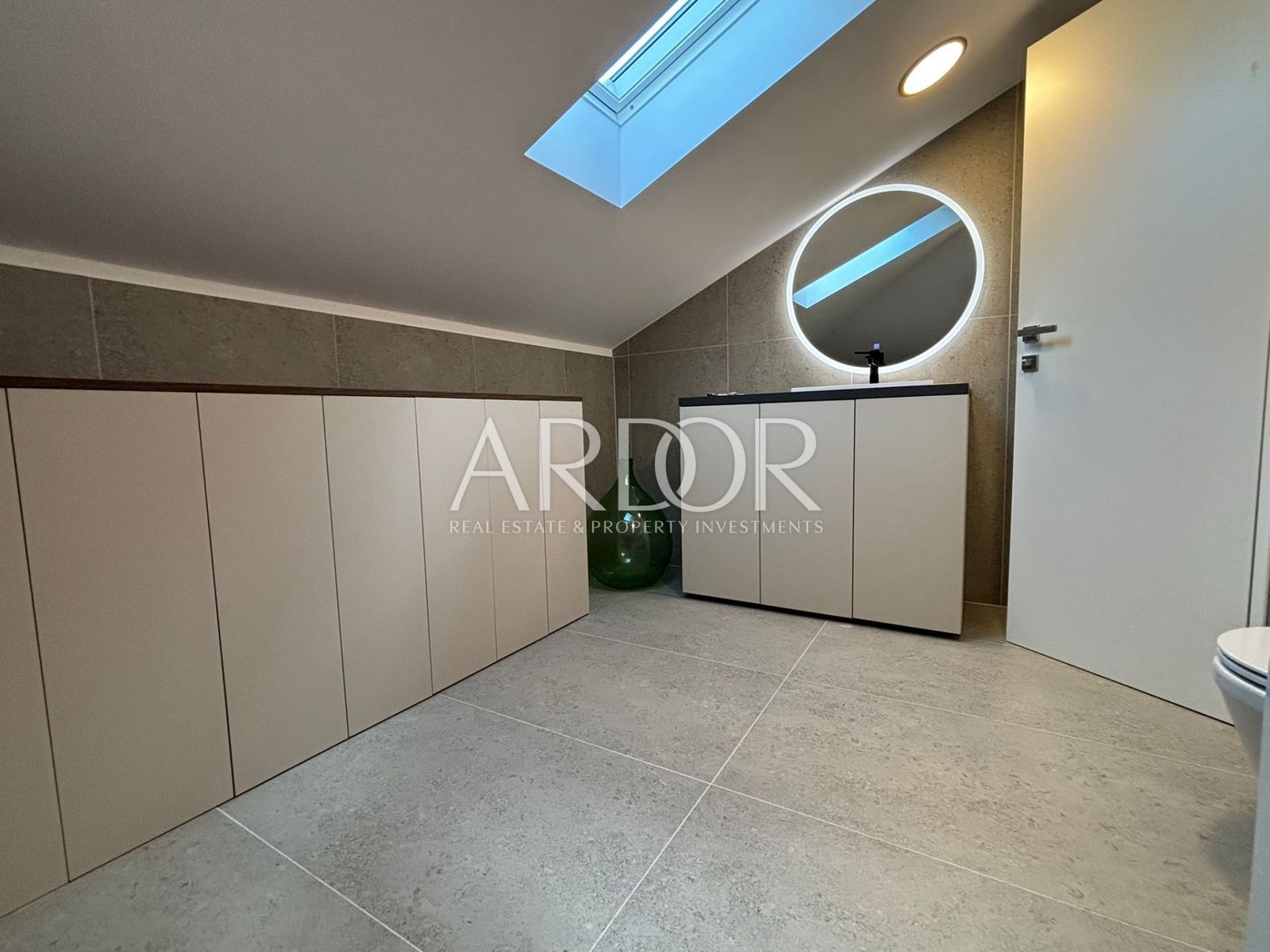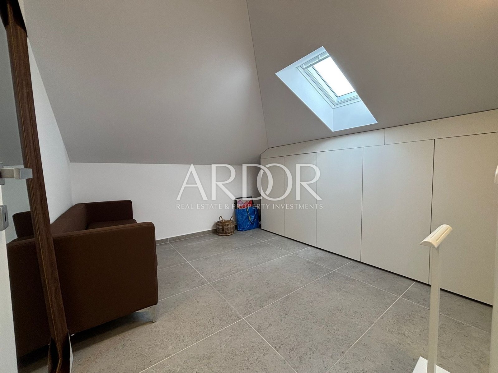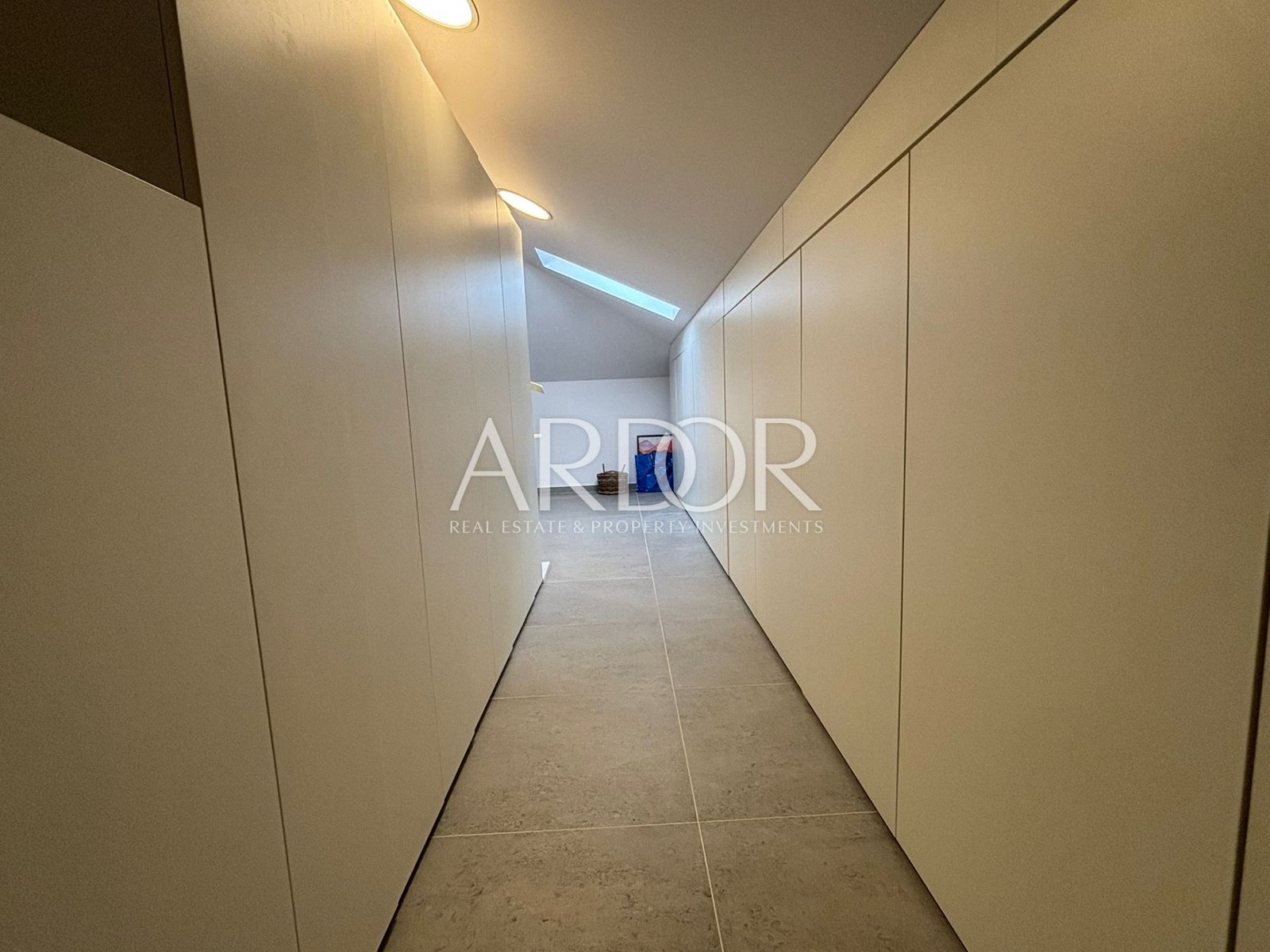 Gornja etaža obuhvaća spavaću sobu, veću garderobu s mogućnošću prenamjene u dodatnu spavaću sobu, kao i glavnu kupaonicu, što omogućuje praktično korištenje prostora.