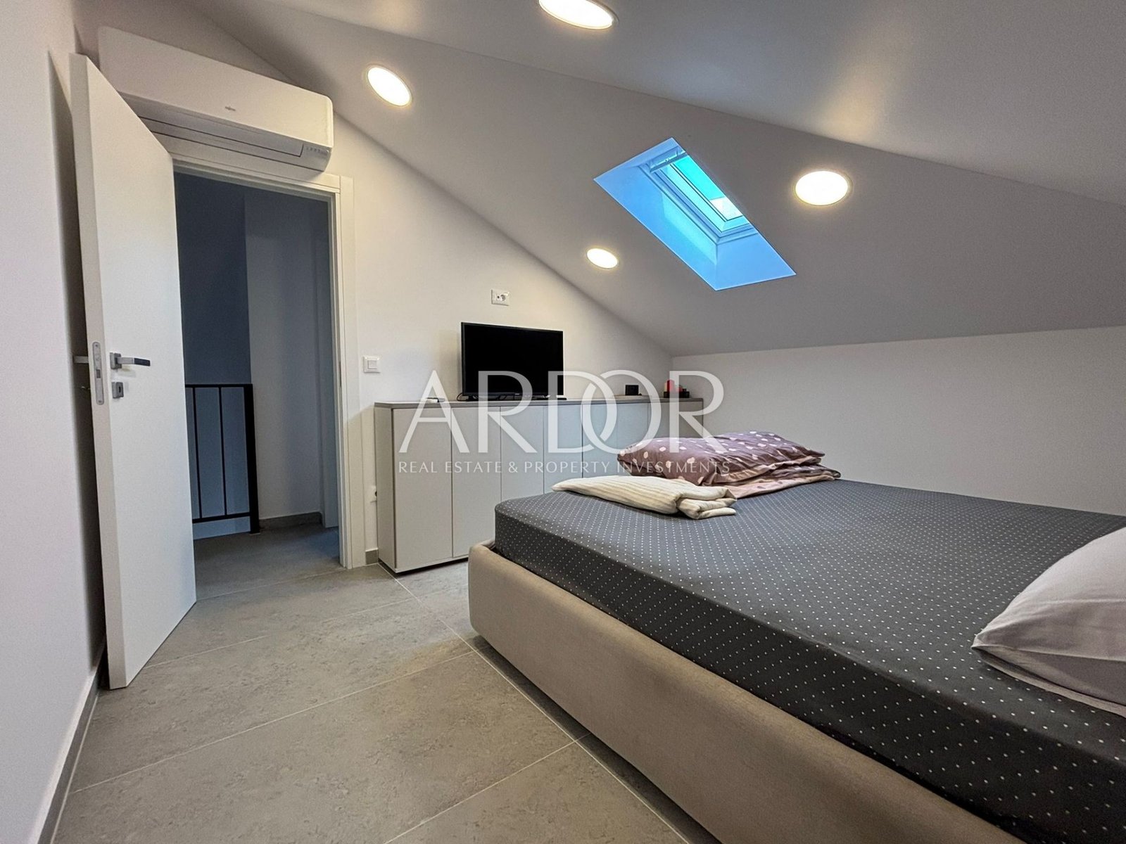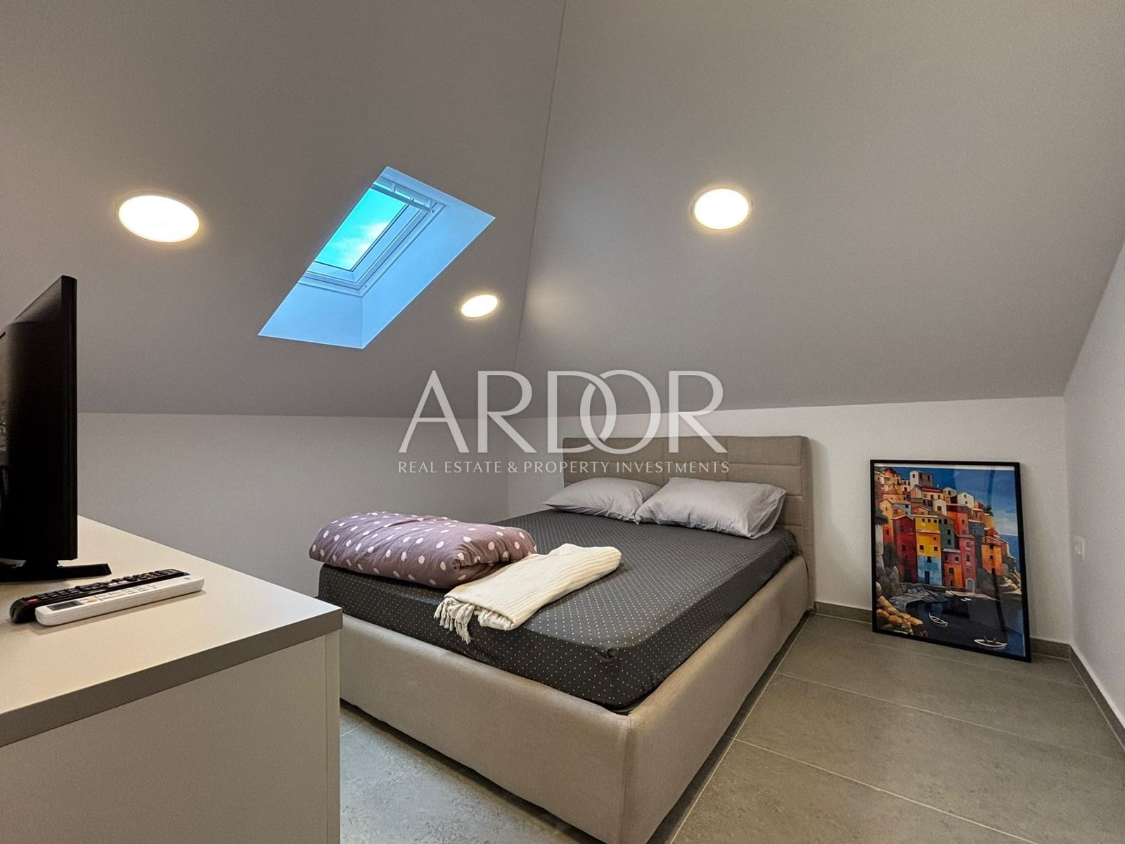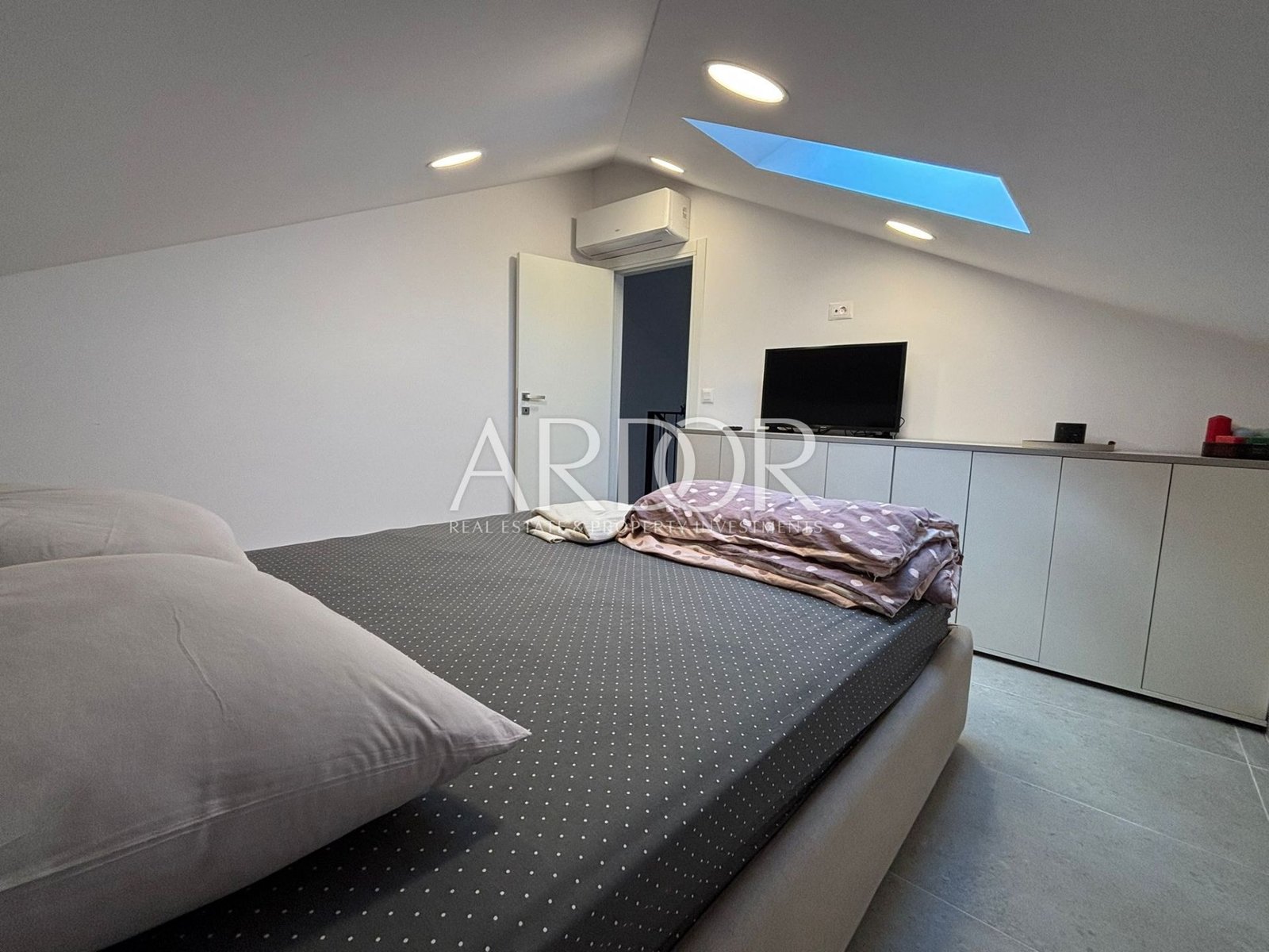 Gornja etaža obuhvaća spavaću sobu, veću garderobu s mogućnošću prenamjene u dodatnu spavaću sobu, kao i glavnu kupaonicu, što omogućuje praktično korištenje prostora.