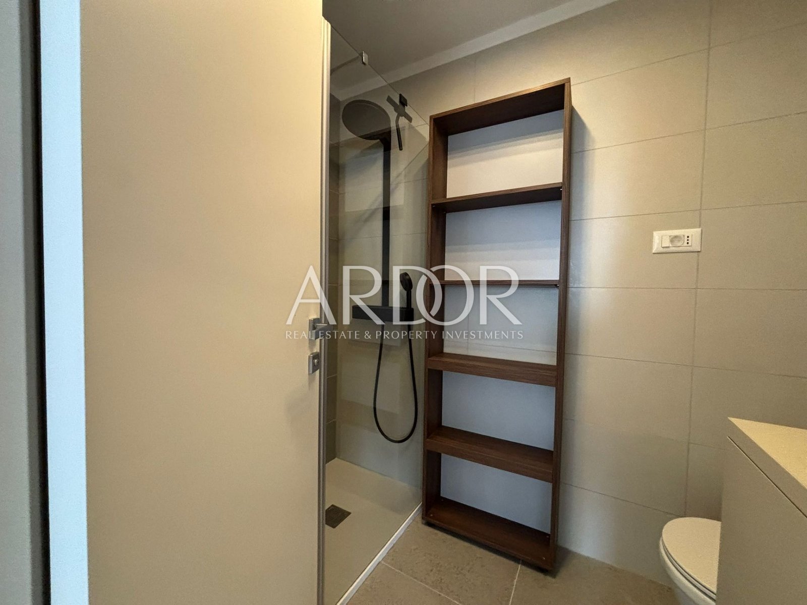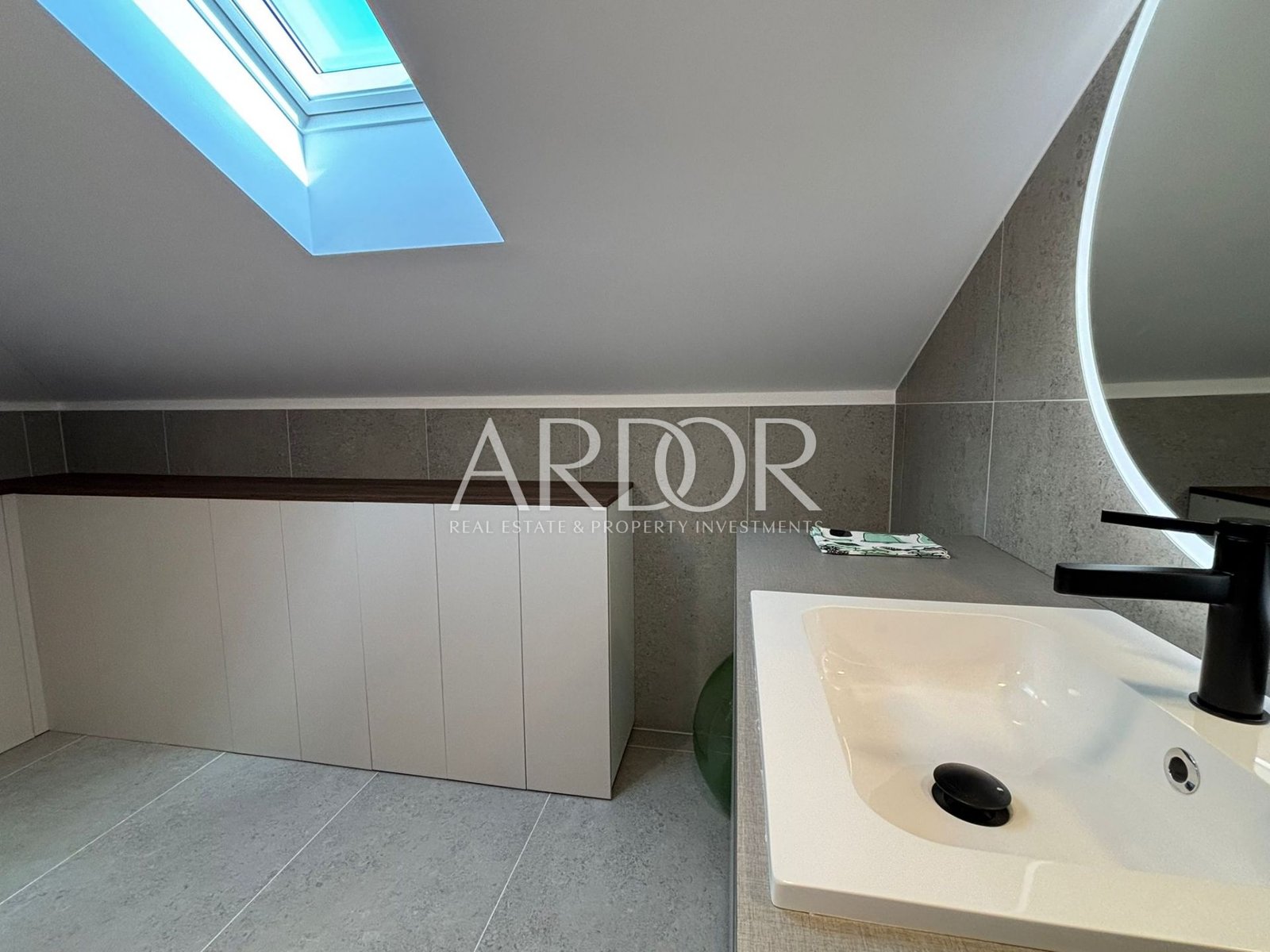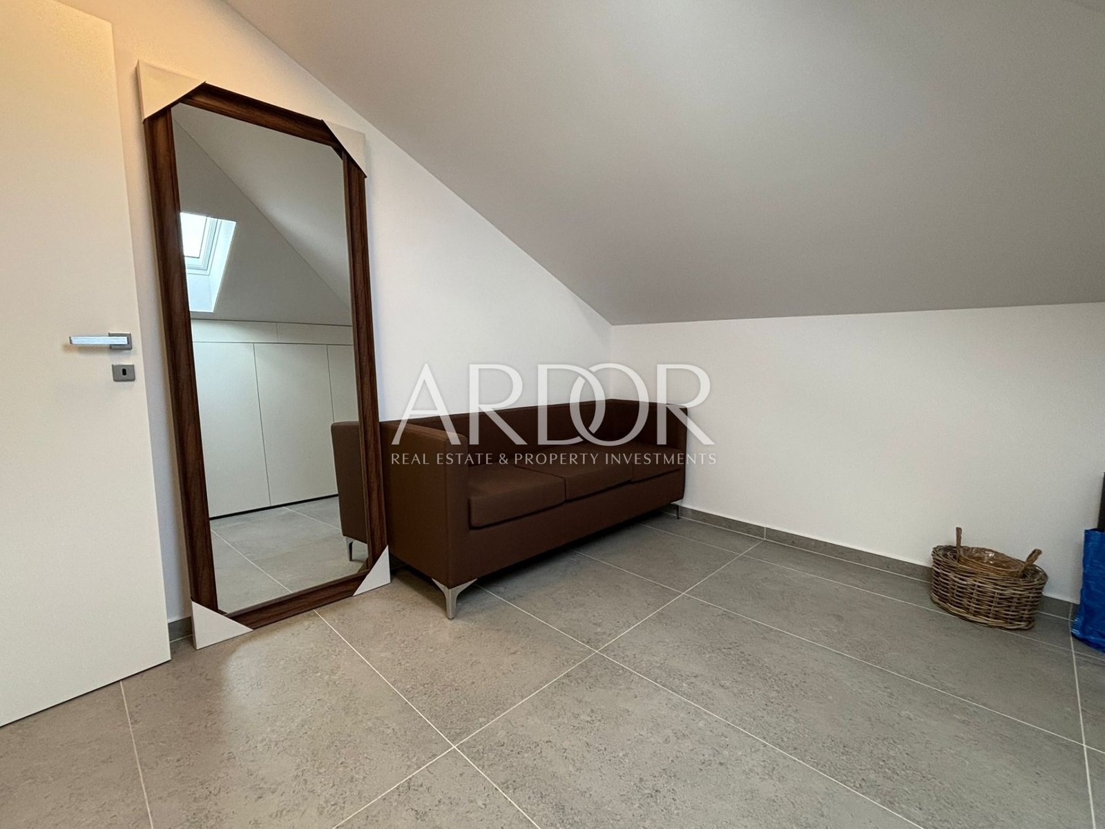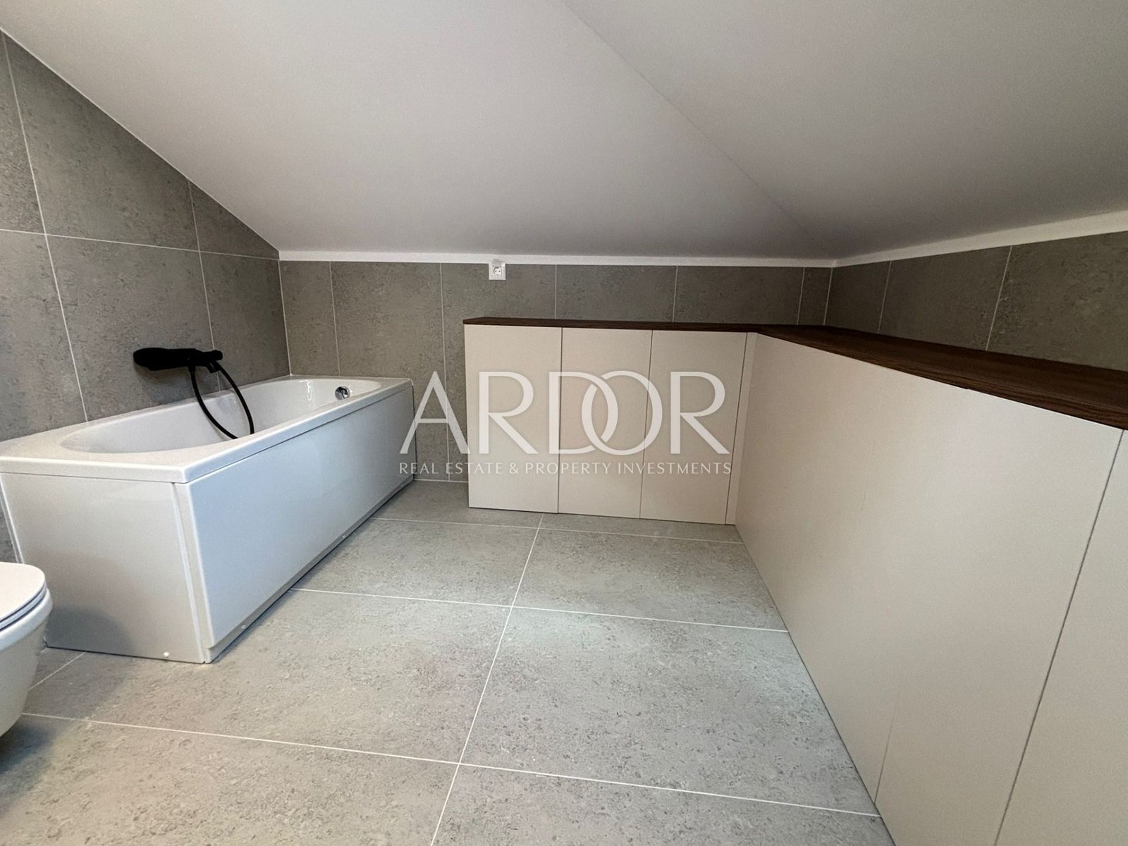 Gornja etaža obuhvaća spavaću sobu, veću garderobu s mogućnošću prenamjene u dodatnu spavaću sobu, kao i glavnu kupaonicu, što omogućuje praktično korištenje prostora.