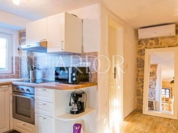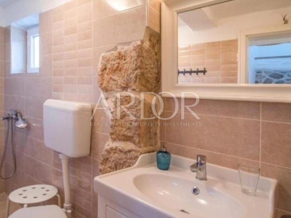 U prizemlju se nalazi autohtona kuhinja sa blagovaonom ,dnevnim boravkom terasom i bazenom sa slapom.