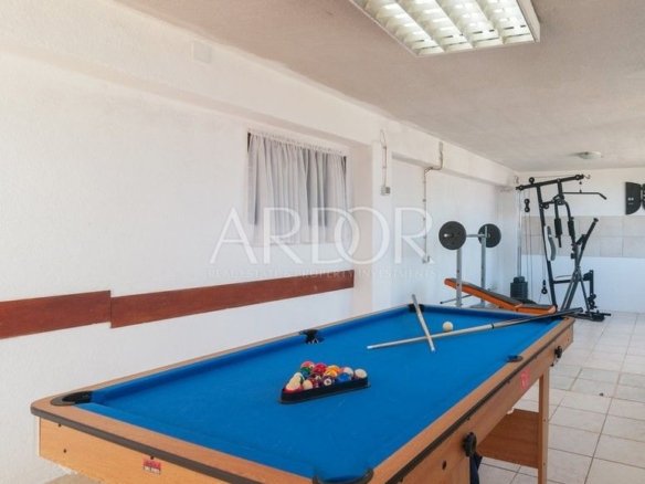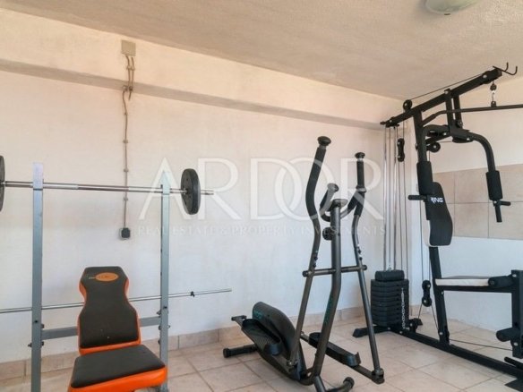 The ground floor contains a garage of about 80 m², which partially serves as a storage room, and an additional room with a view of the sea. The former summer kitchen has now been converted into a mini gym and recreation area, equipped for exercise and fun, with a pool table and darts.