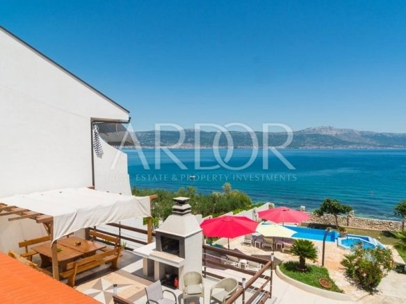 Posredujemo u prodaji kuće u Slatinama na otoku Čiovu, smještene u prvom redu uz more, s direktnim izlazom na plažu! Kuća, izgrađena 1990. godine, nalazi se na zemljištu površine gotovo 800 m² i prostire se na tri etaže, uz dodatno nisko potkrovlje.