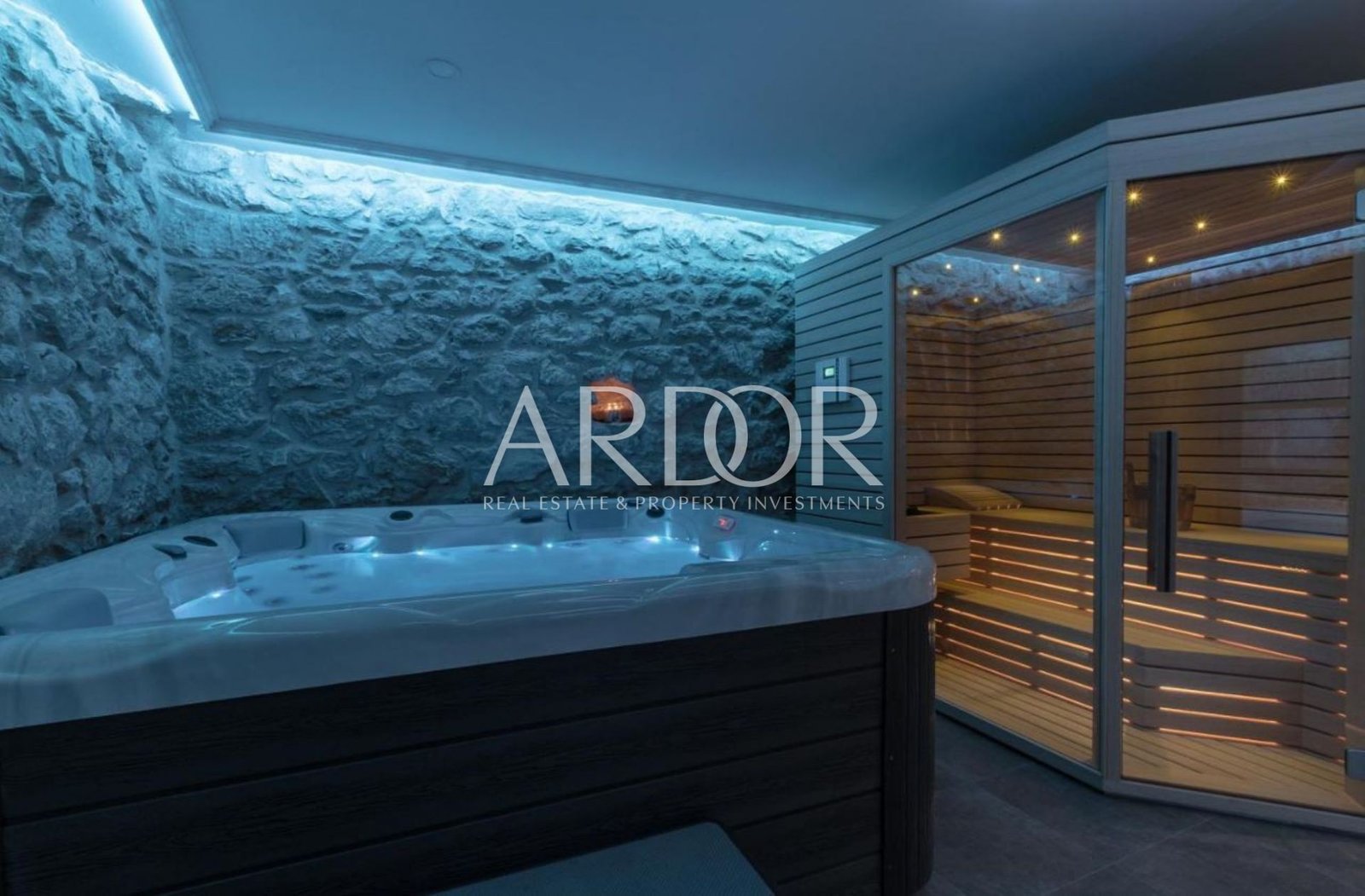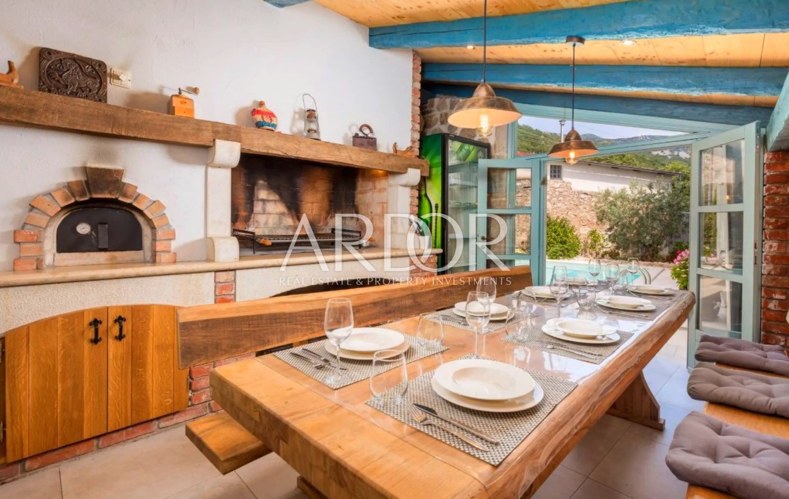 Im Erdgeschoss befindet sich ein heller, offen gestalteter Wohnbereich, der ein elegantes Wohnzimmer mit Kamin, einen großzügigen Essbereich, eine voll ausgestattete Sommerküche sowie einen Wellnessraum mit Jacuzzi und Sauna vereint.