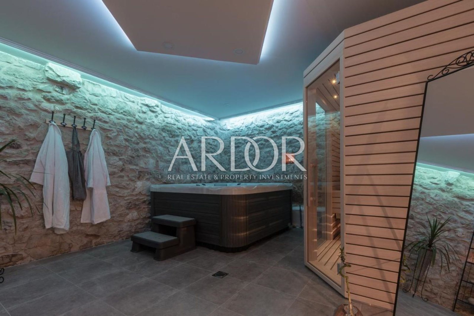 The ground floor features a bright, open-plan living area that combines an elegant living room with a fireplace, a spacious dining area, a fully equipped summer kitchen, and a wellness room with a jacuzzi and sauna.