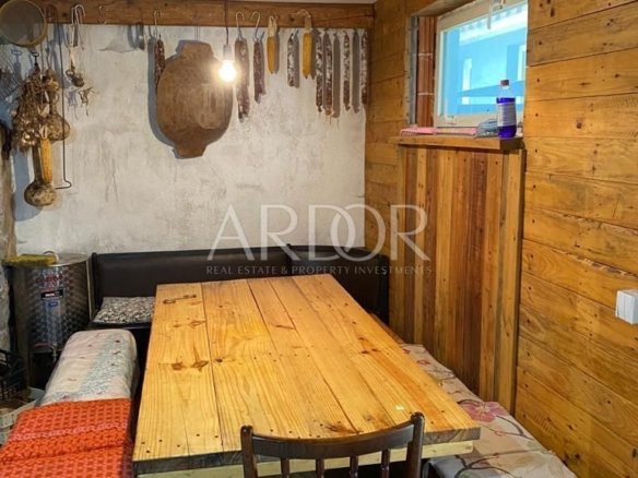 Kuća je okružena zelenom travnatom okućnicom od 1913 m2 uređenom kamenim detaljima, sjedećom garniturom za uživanje u tople ljetne dane te prilaznim putem i vanjskim parkingom. Na posjedu se također nalazi opremljena vrtna kućica, te roštilj!
