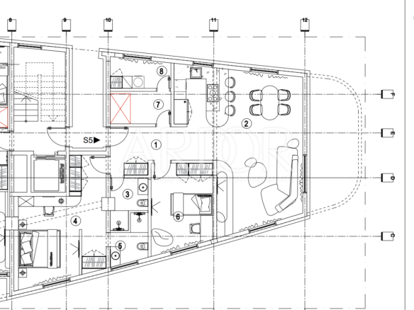 Ground floor, apartment S5, net area 100.87 m2. It consists of an entrance hall (8.23m2), an open space concept kitchen, dining room and living room (41.23m2), two bedrooms, one of which is larger (21.88m2) with its own wardrobe (4.27m2) and a bathroom ( 3.78 m2), other smaller rooms (12.84 m2), covered terraces (17.35 m2), uncovered terraces (157.66 m2) and storage rooms (4.95 m2). The apartment also includes parking space No. 63, with an area of 13.25 m2, and storage area No. 27 with an area of 2.76 m2.