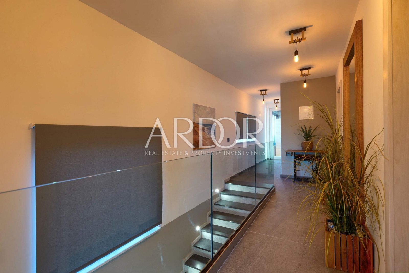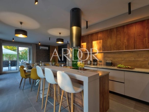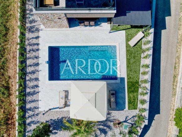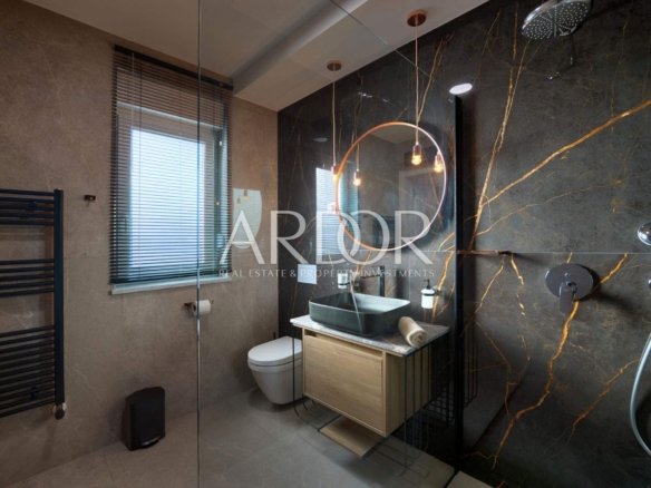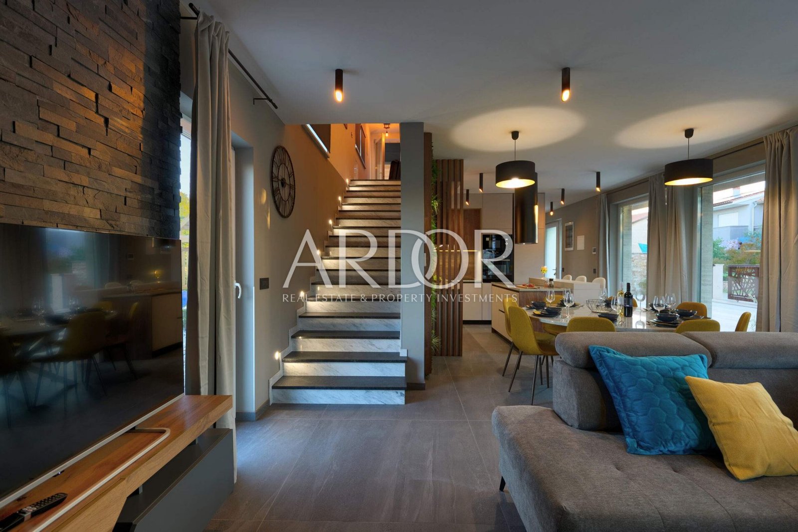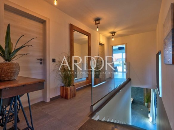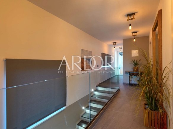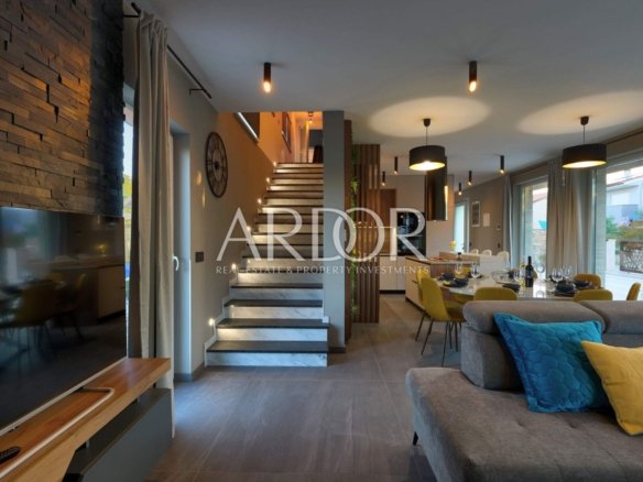 Unutrašnjost kuće odiše modernim luksuzom i toplinom doma. Središnji dio čini prostrani dnevni boravak povezan s elegantno uređenom kuhinjom i blagovaonicom, savršenim prostorom za druženje ili odmor. Vila ima četiri udobne spavaće sobe, svaka sa svojom vrhunski opremljenom kupaonicom, što omogućava potpunu privatnost i udobnost svim ukućanima i gostima. Dizajnerski detalji i pažljivo odabrani materijali stvaraju dojam sofisticiranosti i bezvremenskog stila.