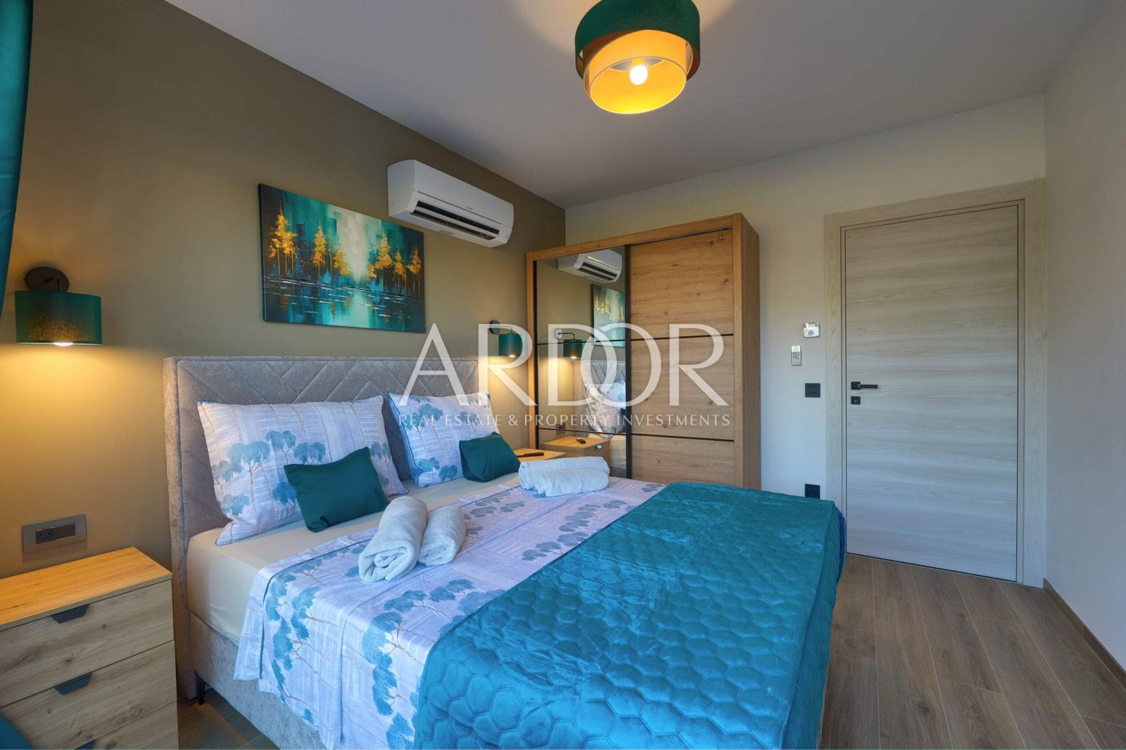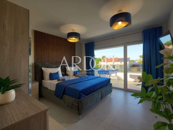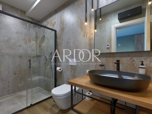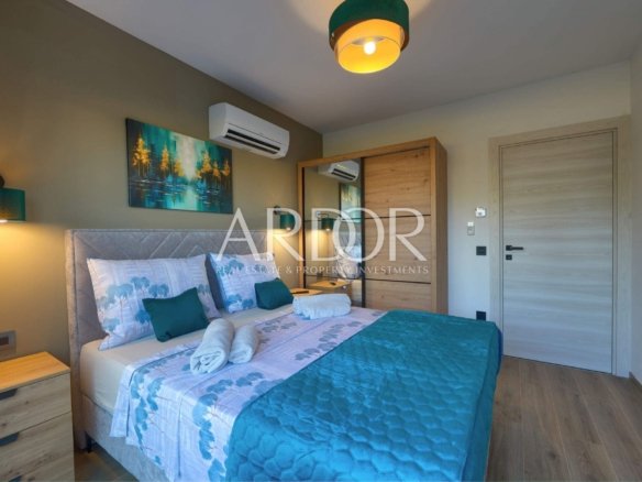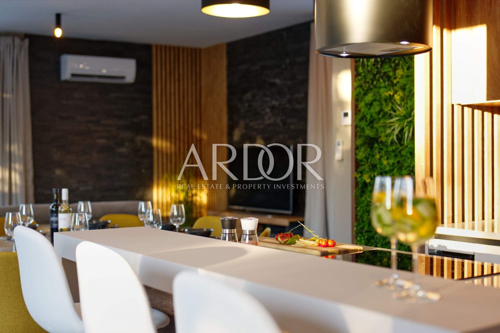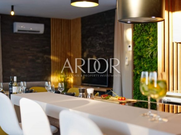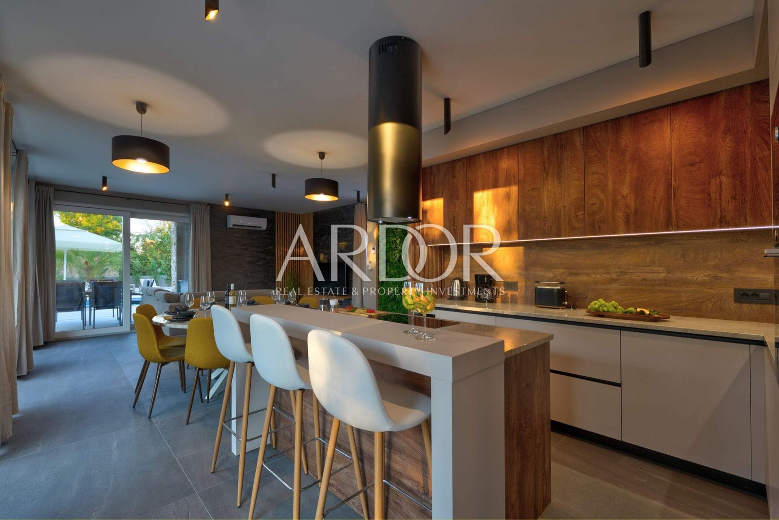 Unutrašnjost kuće odiše modernim luksuzom i toplinom doma. Središnji dio čini prostrani dnevni boravak povezan s elegantno uređenom kuhinjom i blagovaonicom, savršenim prostorom za druženje ili odmor. Vila ima četiri udobne spavaće sobe, svaka sa svojom vrhunski opremljenom kupaonicom, što omogućava potpunu privatnost i udobnost svim ukućanima i gostima. Dizajnerski detalji i pažljivo odabrani materijali stvaraju dojam sofisticiranosti i bezvremenskog stila.