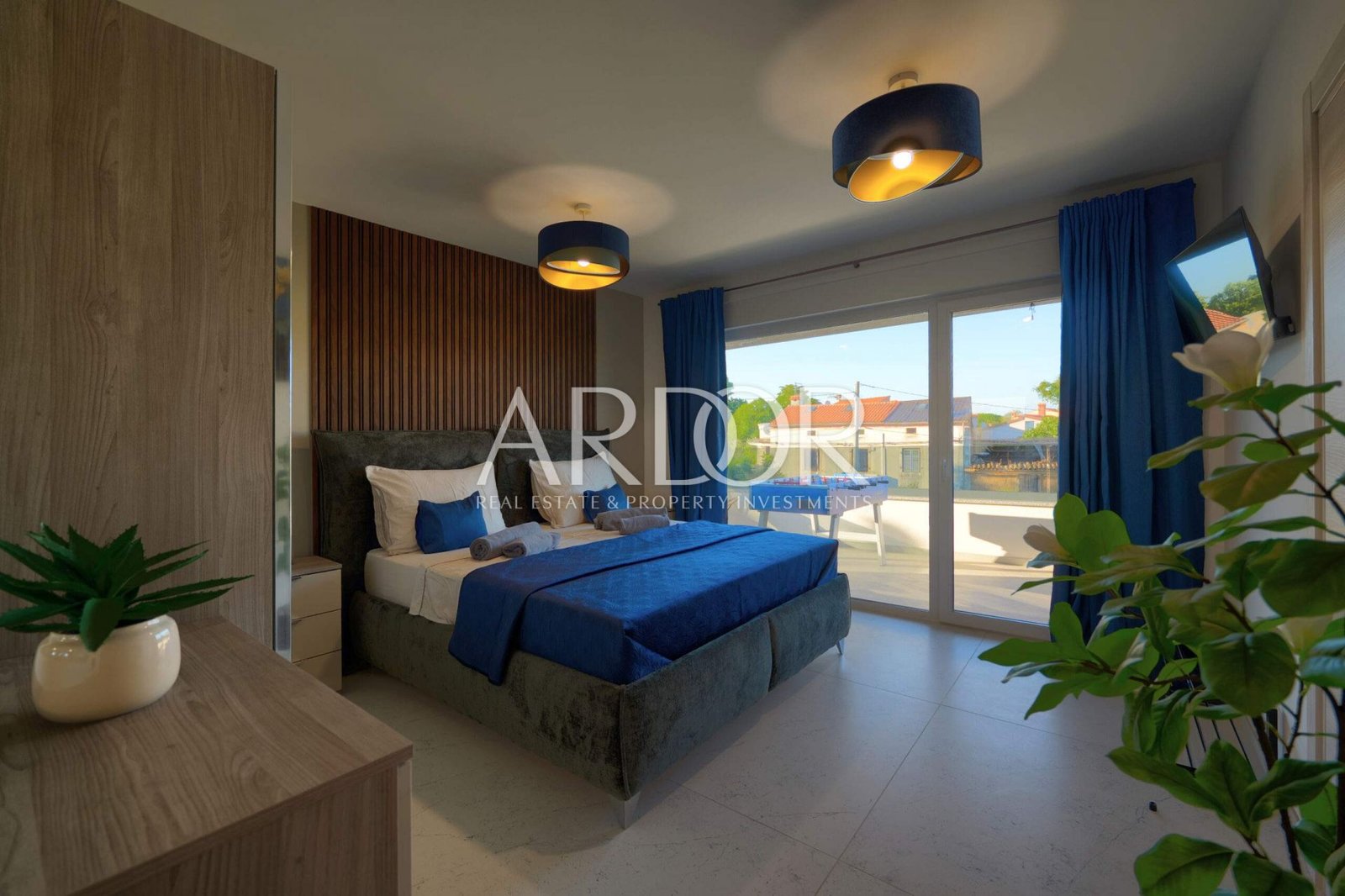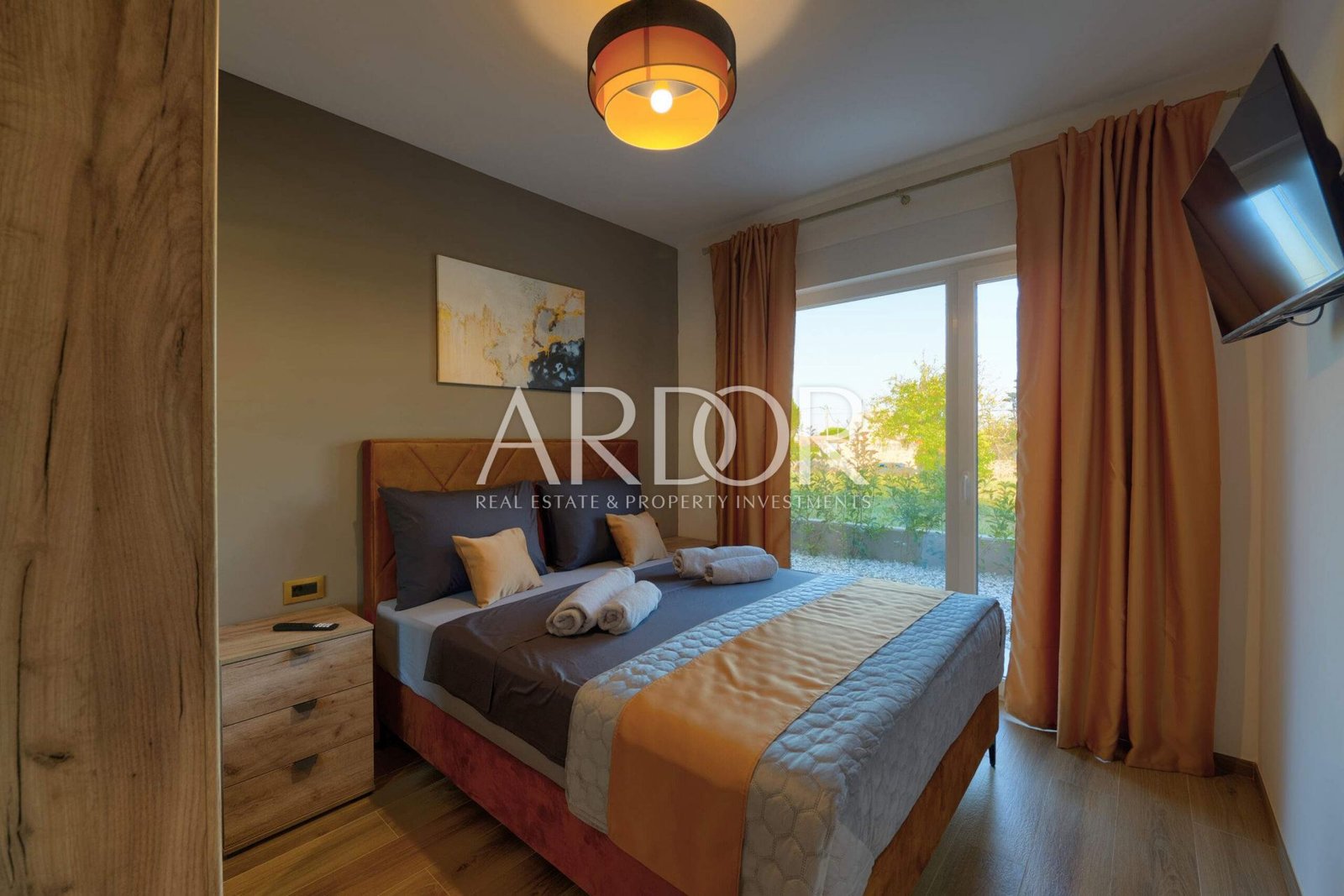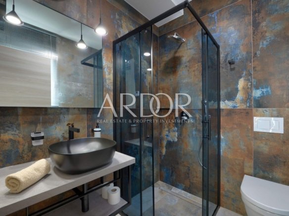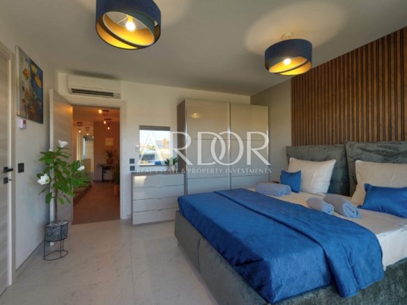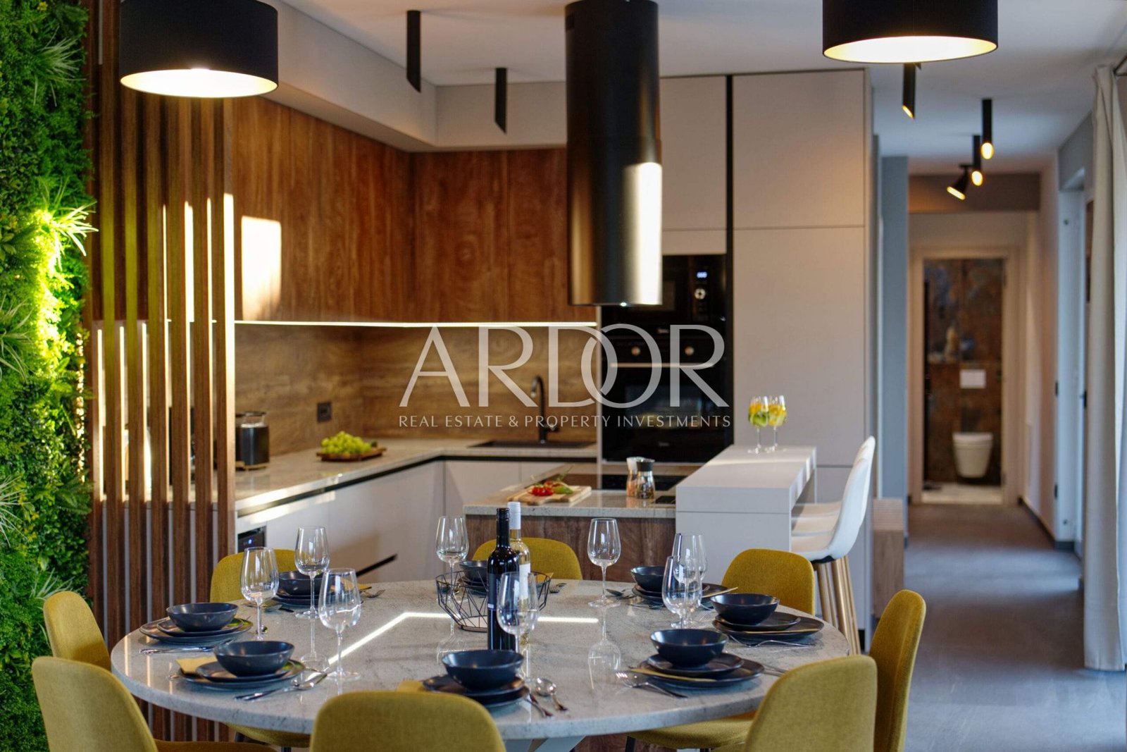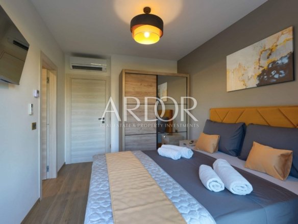 Unutrašnjost kuće odiše modernim luksuzom i toplinom doma. Središnji dio čini prostrani dnevni boravak povezan s elegantno uređenom kuhinjom i blagovaonicom, savršenim prostorom za druženje ili odmor. Vila ima četiri udobne spavaće sobe, svaka sa svojom vrhunski opremljenom kupaonicom, što omogućava potpunu privatnost i udobnost svim ukućanima i gostima. Dizajnerski detalji i pažljivo odabrani materijali stvaraju dojam sofisticiranosti i bezvremenskog stila.