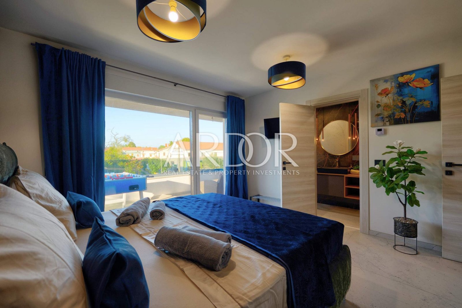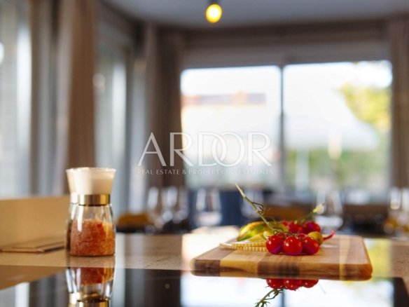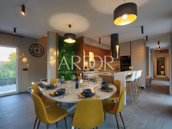 Notranjost hiše izžareva sodoben luksuz in toplino doma. Osrednji del sestavlja prostorna dnevna soba, povezana z elegantno opremljeno kuhinjo in jedilnico, ki je popoln prostor za druženje ali sprostitev. Vila ima štiri udobne spalnice, vsaka s svojo vrhunsko opremljeno kopalnico, kar omogoča popolno zasebnost in udobje za vse člane gospodinjstva in goste. Oblikovalski detajli in skrbno izbrani materiali ustvarjajo vtis prefinjenosti in brezčasnega sloga.