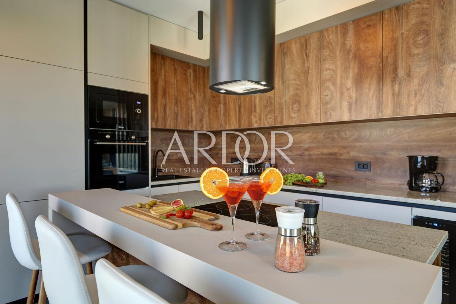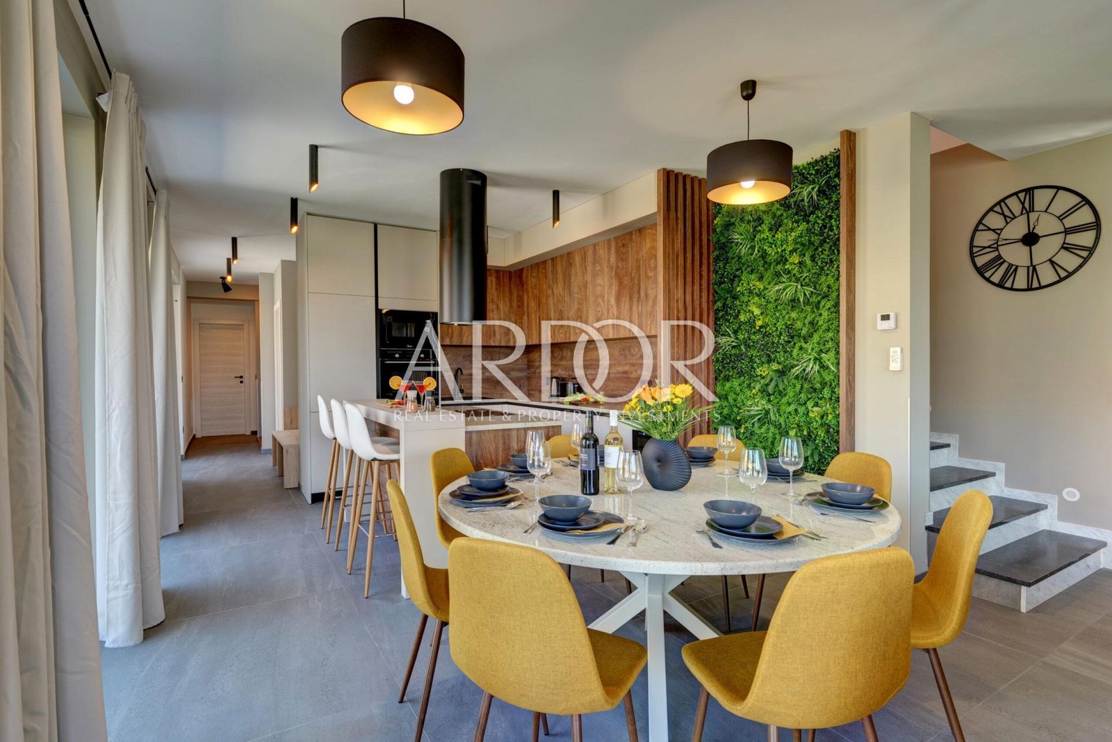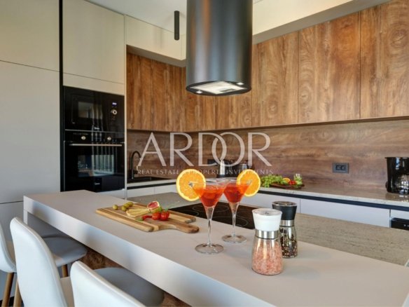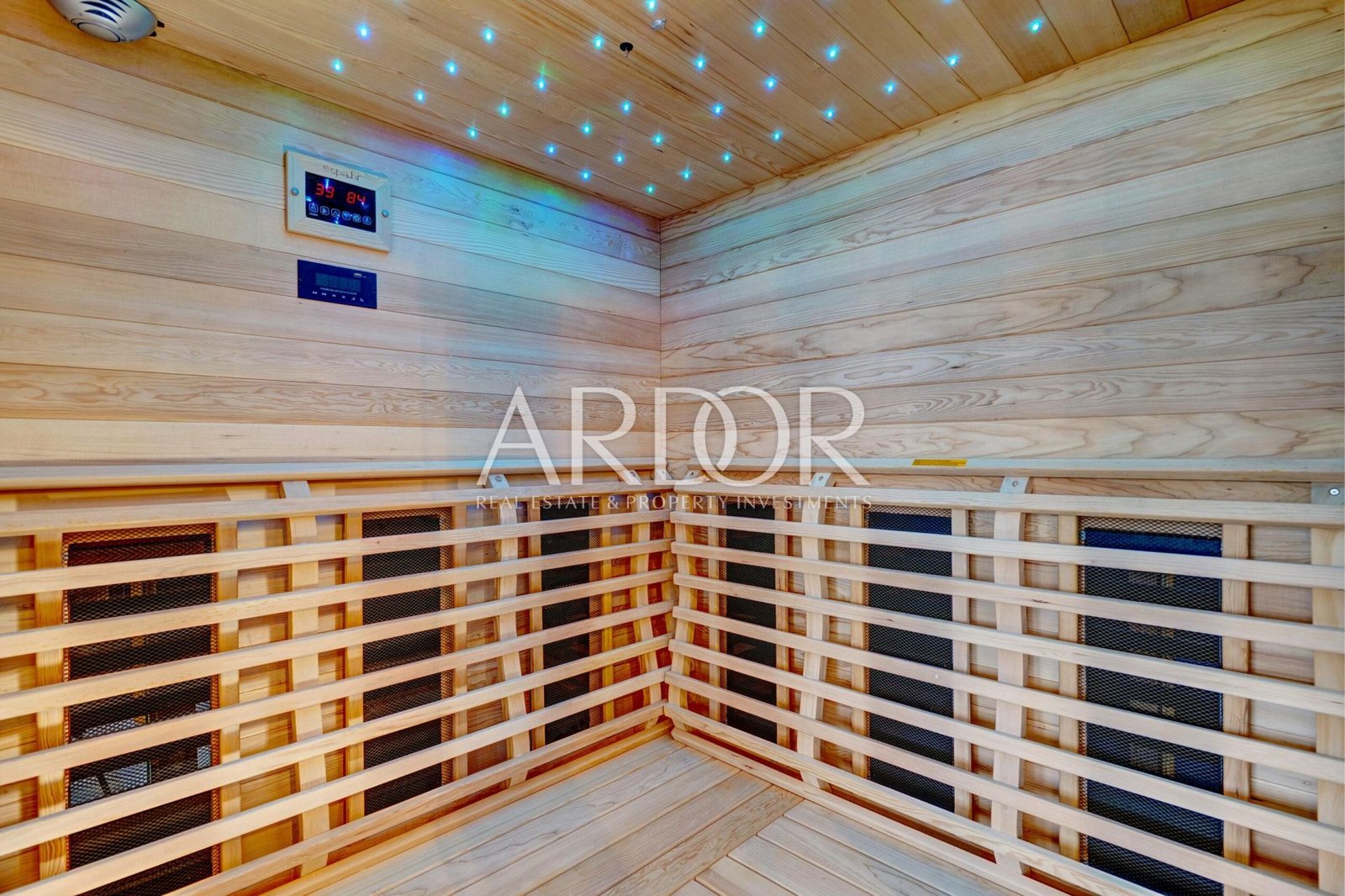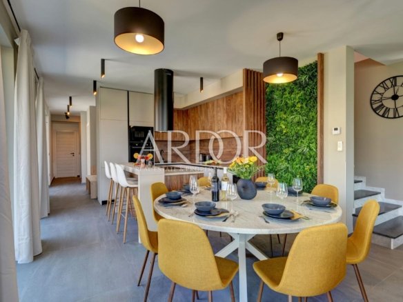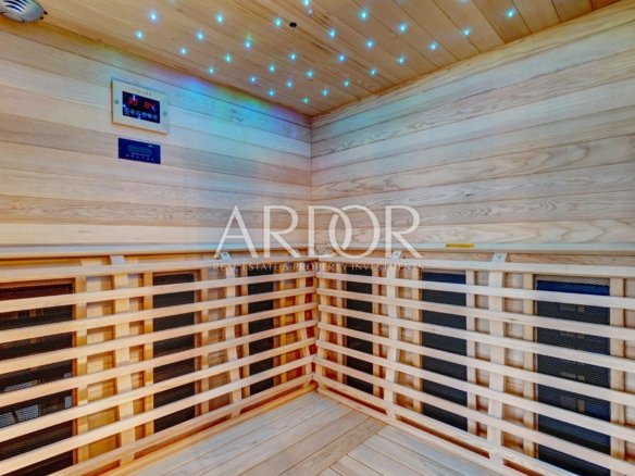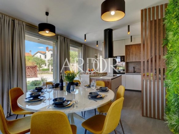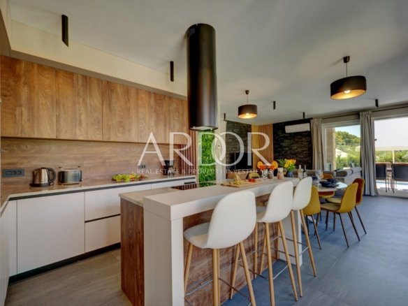 Notranjost vile izžareva prefinjenost – odprt dnevni prostor z moderno zasnovano kuhinjo in jedilnico tvori središče hiše, idealno za družinska srečanja in sprostitev. Štiri prostorne spalnice, vsaka s svojo luksuzno opremljeno kopalnico, zagotavljajo maksimalno zasebnost in udobje, skrbno izbrani detajli pa poudarjajo sodoben slog in občutek ekskluzivnosti.