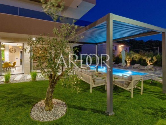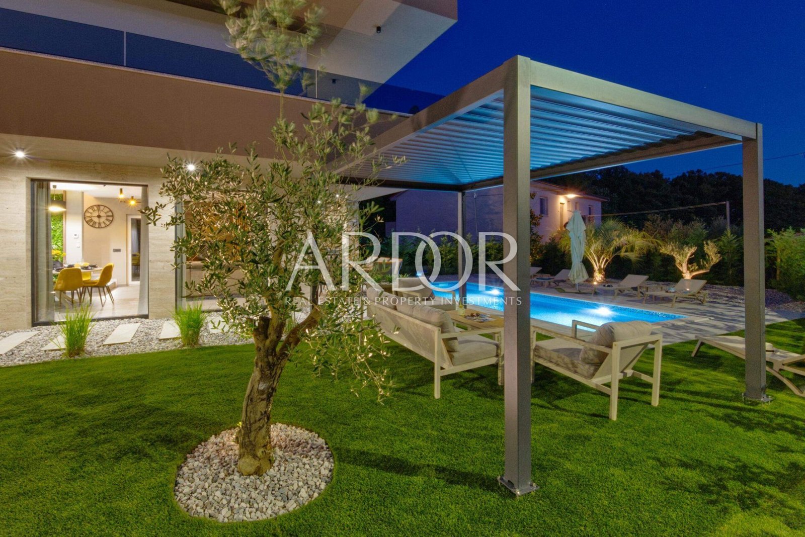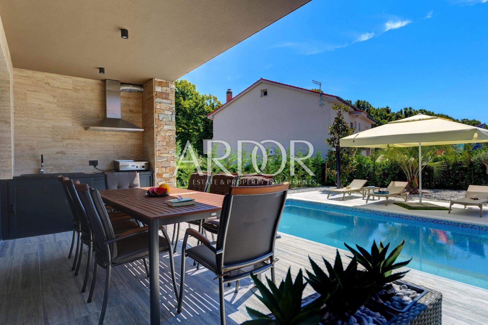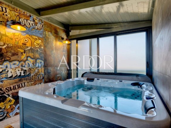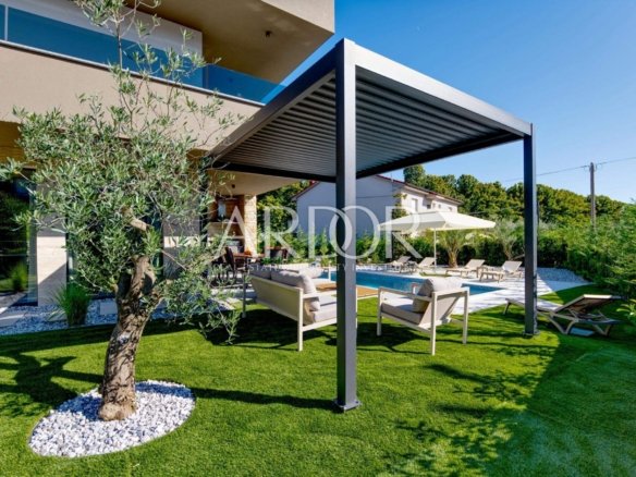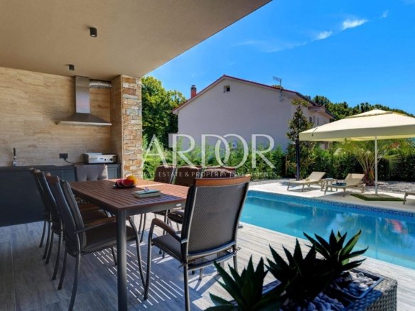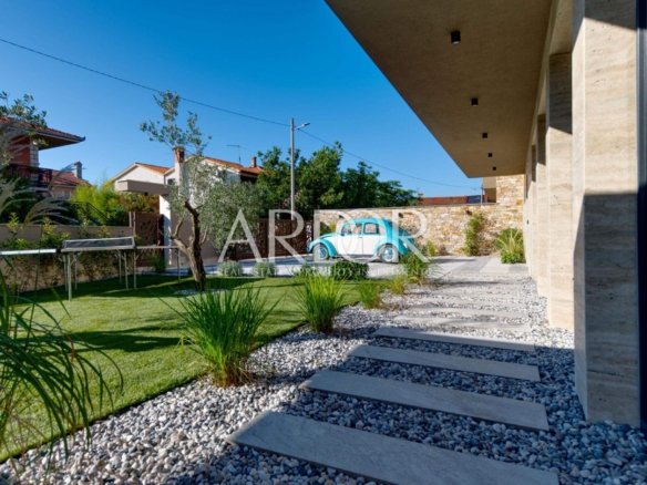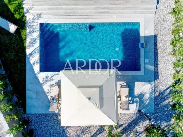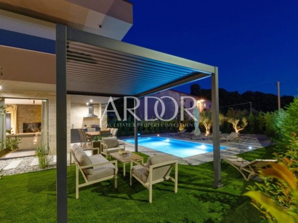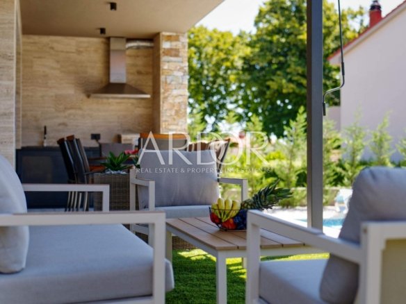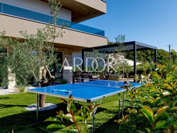 Vanjski prostor jednako je dojmljiv – uređeni vrt s bazenom i jacuzzijem poziva na uživanje u suncu i potpunom opuštanju. Prostrana terasa i vanjska kuhinja stvorene su za nezaboravna druženja na otvorenom, dok posebno osmišljen kutak za djecu čini ovu vilu savršenim izborom za obitelji.