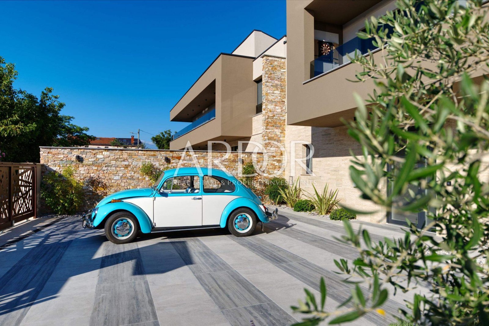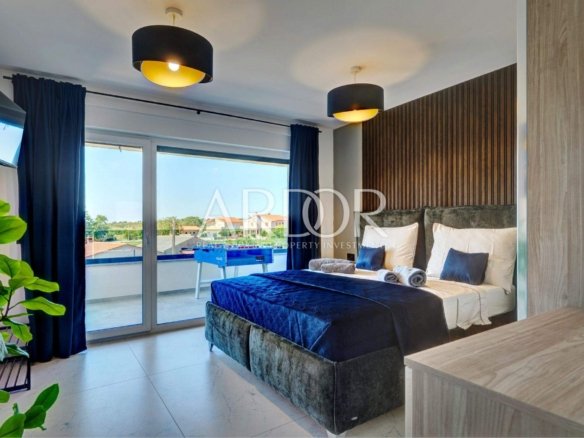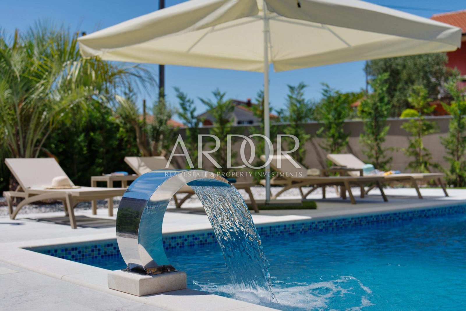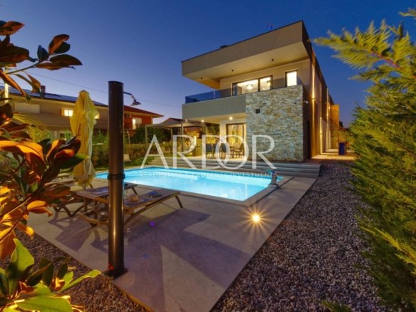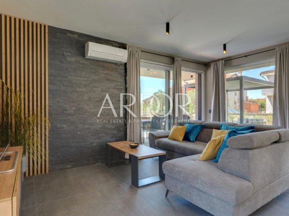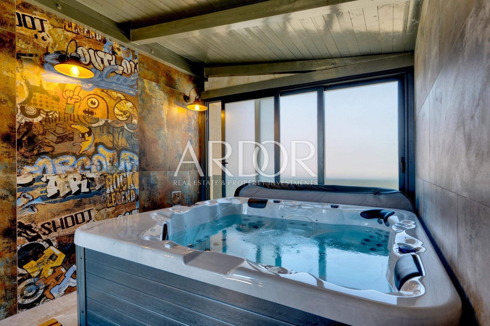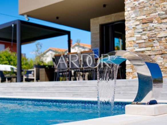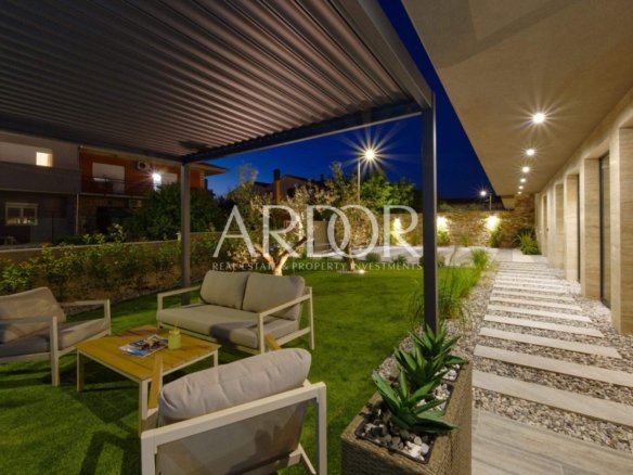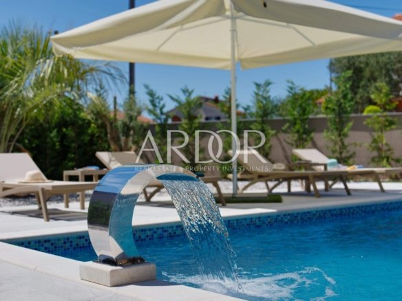 Vanjski prostor jednako je dojmljiv – uređeni vrt s bazenom i jacuzzijem poziva na uživanje u suncu i potpunom opuštanju. Prostrana terasa i vanjska kuhinja stvorene su za nezaboravna druženja na otvorenom, dok posebno osmišljen kutak za djecu čini ovu vilu savršenim izborom za obitelji.