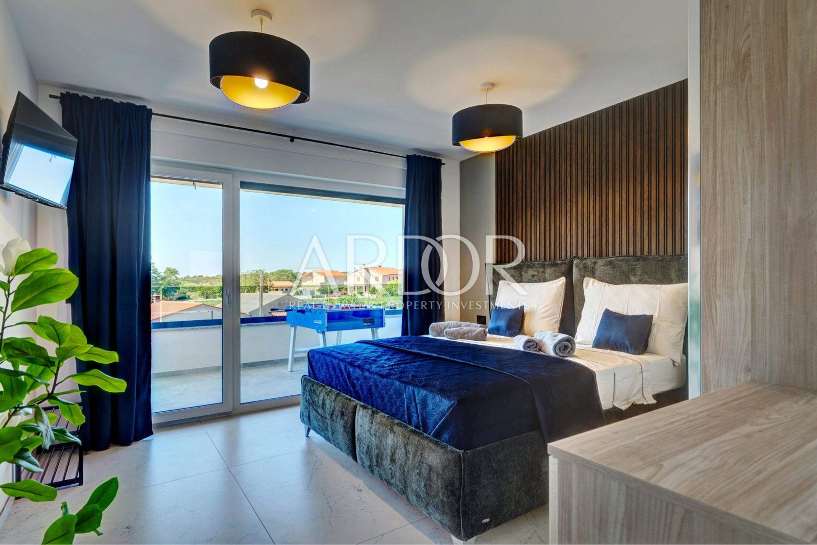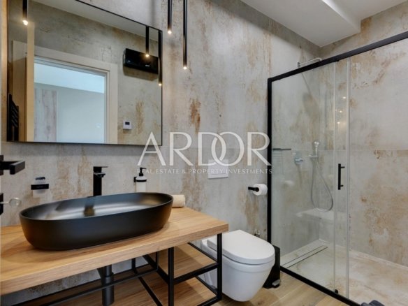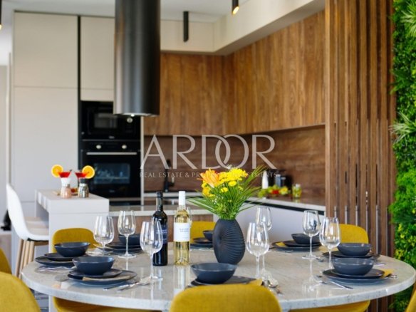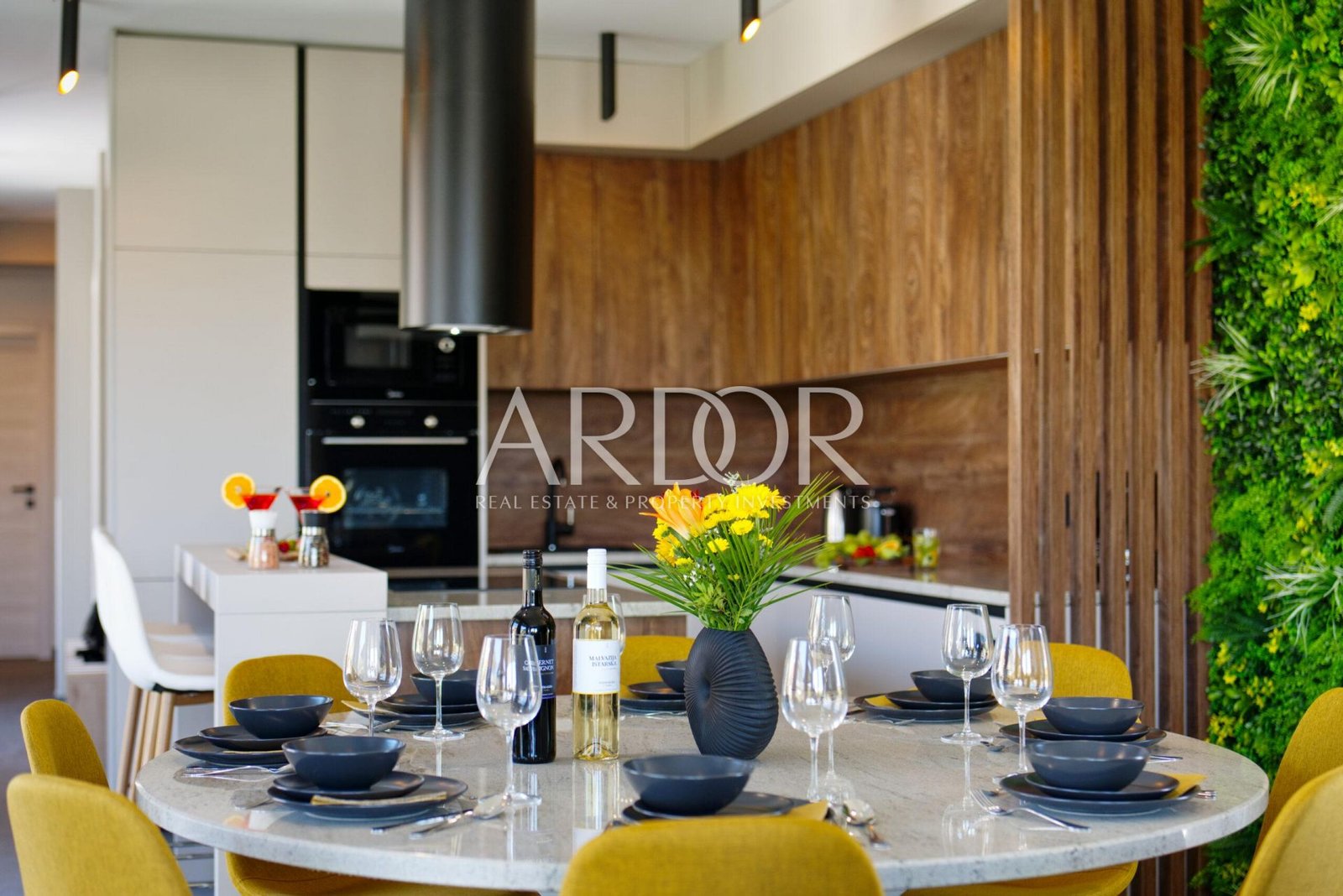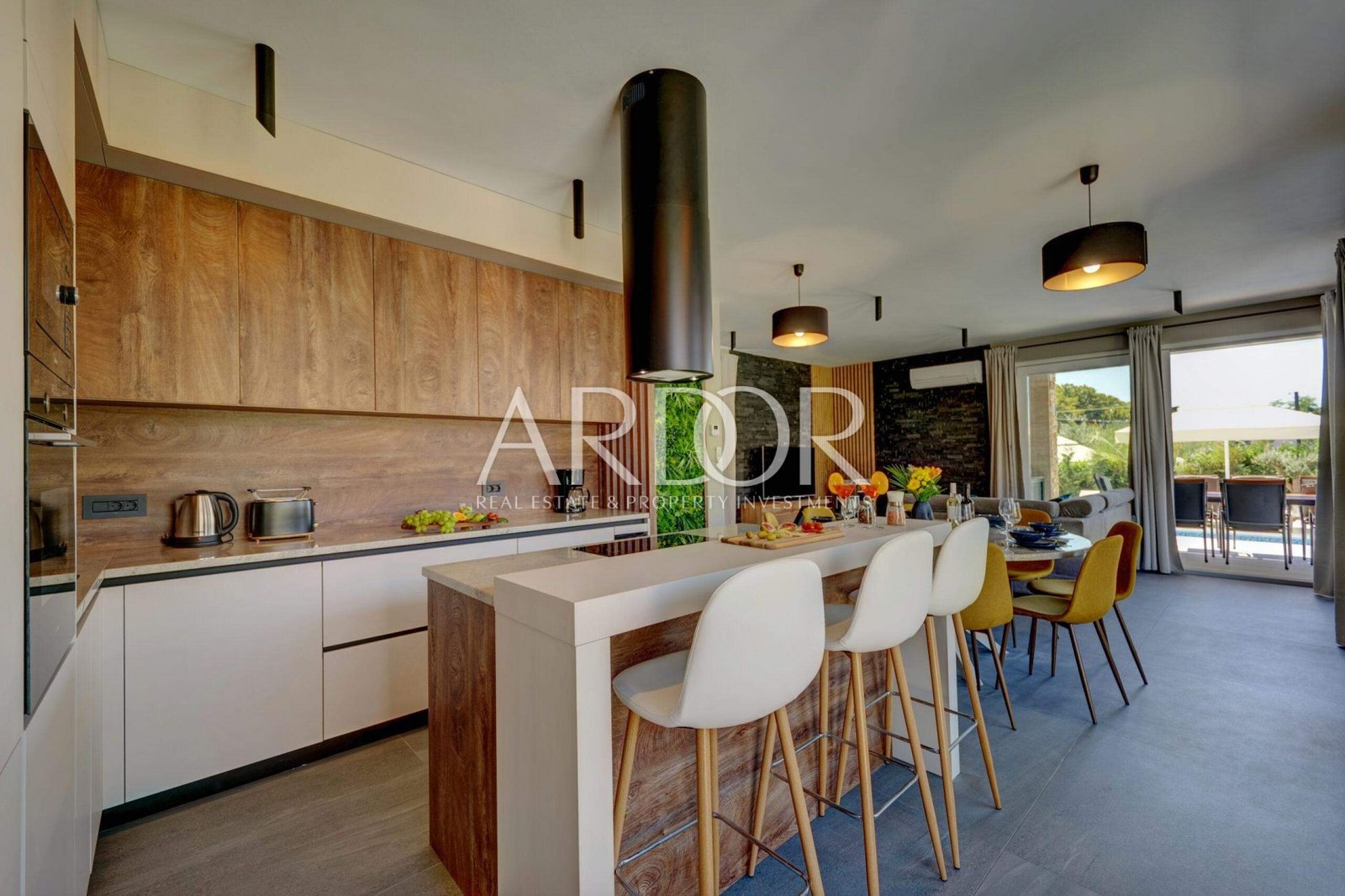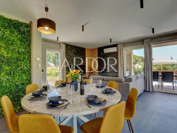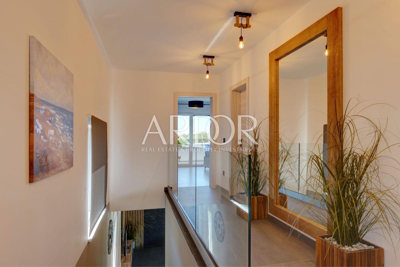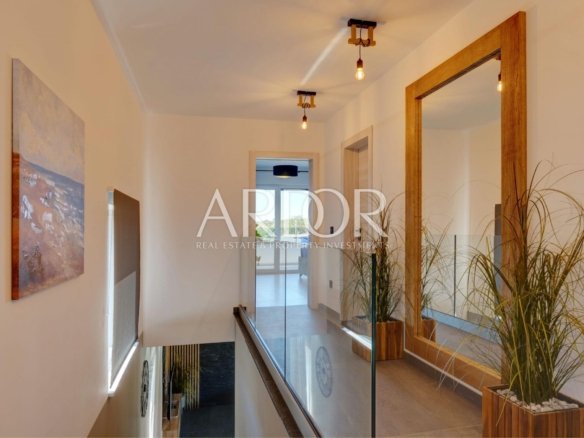 Unutrašnjost vile odiše profinjenošću – otvoreni dnevni boravak s moderno dizajniranom kuhinjom i blagovaonicom čini središte kuće, idealno za obiteljska druženja i opuštanje. Četiri prostrane spavaće sobe, svaka s vlastitom luksuzno uređenom kupaonicom, pružaju maksimalnu privatnost i udobnost, dok pažljivo odabrani detalji naglašavaju suvremeni stil i osjećaj ekskluzivnosti.