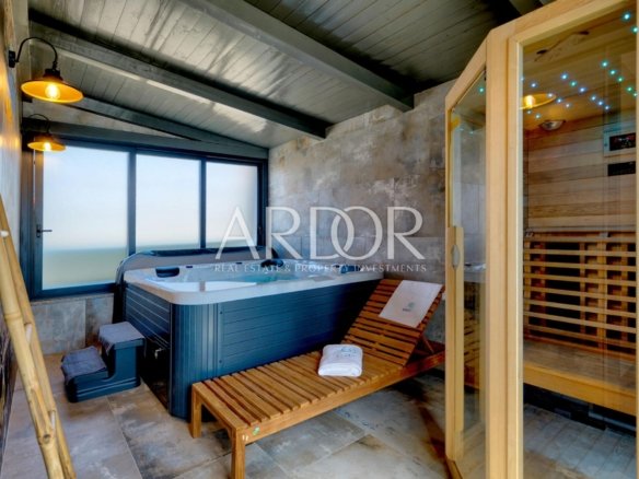 Zunanji prostor je prav tako impresiven – urejen vrt z bazenom in jacuzzijem vabi k uživanju na soncu in popolni sprostitvi. Prostorna terasa in zunanja kuhinja sta ustvarjeni za nepozabna druženja na prostem, posebej zasnovan kotiček za otroke pa naredi to vilo popolno izbiro za družine.