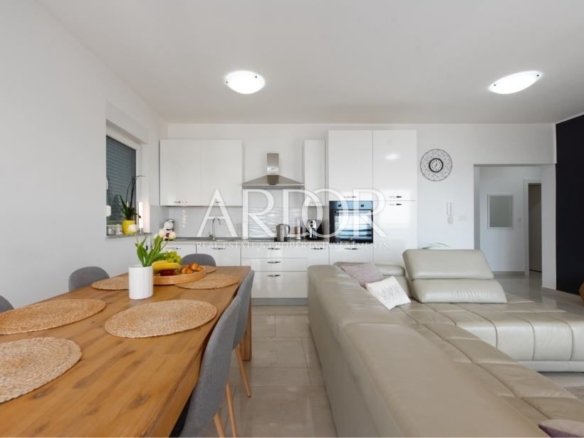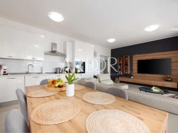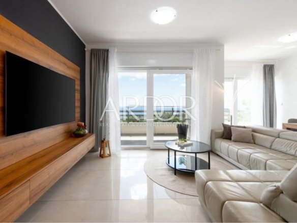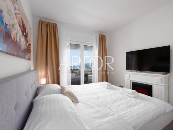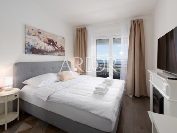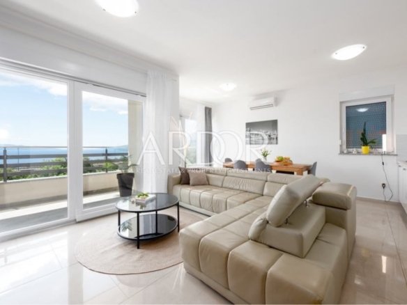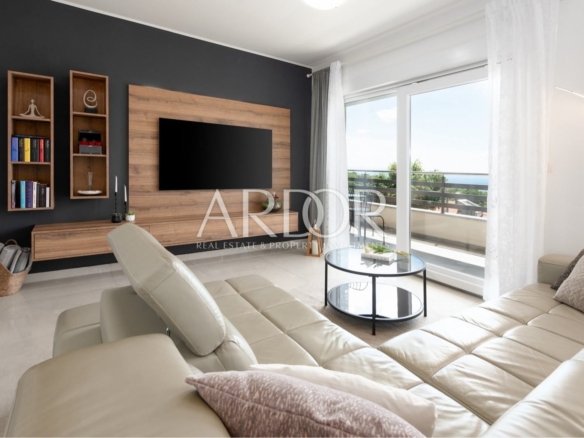 L'appartamento è concepito come un trilocale con soggiorno (3 camere da letto + 1 bagno) e un ulteriore sottotetto di 25 m², che può essere facilmente convertito in zona giorno, studio o relax, se lo si desidera. Gli interni trasmettono calore e armonia, con mobili accuratamente selezionati e dettagli moderni che creano un senso di eleganza e comfort abitativo. L'ampio soggiorno, collegato alla cucina e alla sala da pranzo, si apre su un ampio balcone con una vista spettacolare sul mare e sulla Riviera di Abbazia, il luogo ideale per un caffè mattutino o per ammirare il tramonto.