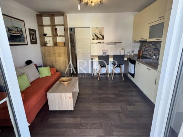 Stanovanje je sestavljeno iz spalnice, svetle dnevne sobe, povezane s kuhinjo in jedilnico, ter kopalnice s tušem. Dnevni prostor se odpira na teraso, idealno za uživanje v jutranji kavi ali večerno sproščanje ob morju.