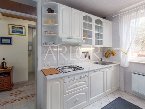 Visoko pritličje nas vodi v dnevno sobo in kuhinjo z jedilnico, iz katere je izhod na prostorno teraso – zimski vrt, kjer poleti in pozimi lahko uživate v panoramskem pogledu na morje. V pritličju sta dve spalnici, kopalnica z wc-jem, ločen wc za goste in shramba.