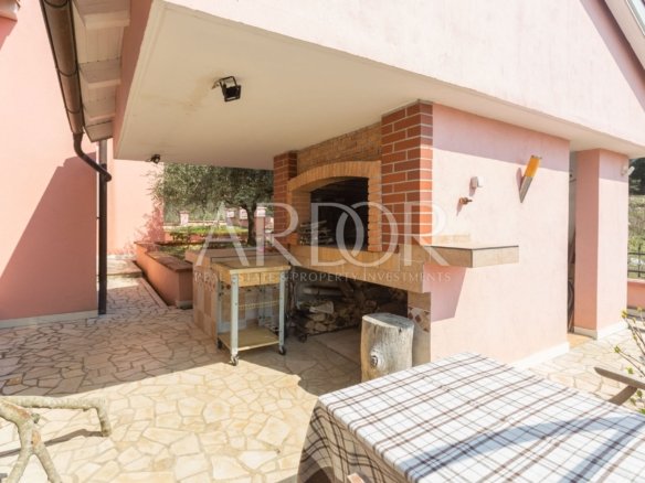 Prostrana okućnica ove velebne vile omogućava uživanje u druženju s obitelji i prijateljima na ljetnoj kuhinji na kojoj se nalazi zidani roštilj sa stolom za objedovanje, bazen te vanjski tuš.