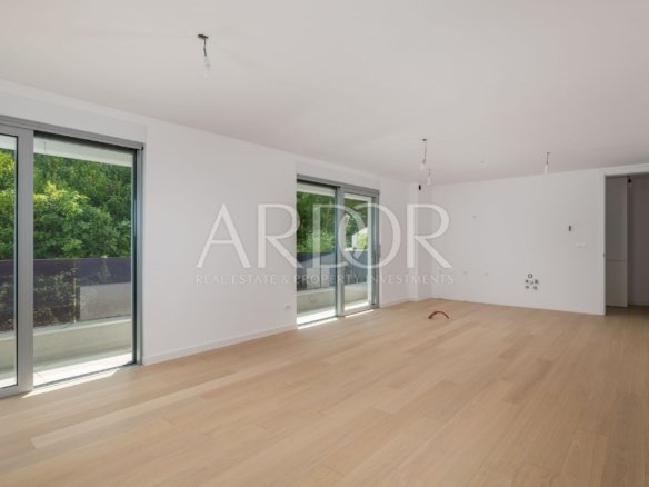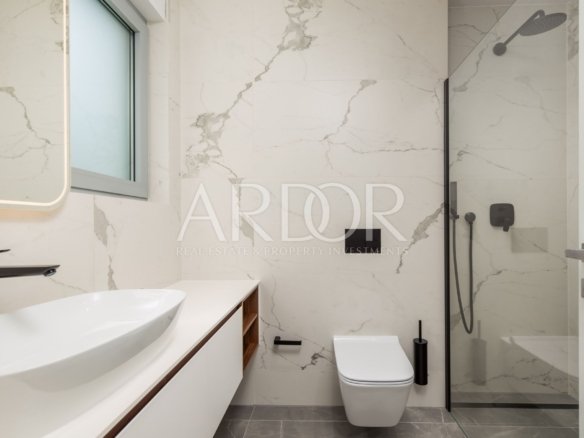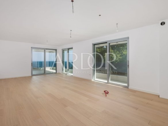 Unutrašnjost uključuje dvije spavaće sobe, svaka s vlastitom kupaonicom i tušem, dodatnu kupaonicu za goste, kao i prostrani dnevni boravak s kuhinjom i blagovaonicom. Ovaj otvoreni prostor savršeno je povezan s velikim balkonom, savršenim za uživanje u panoramskom pogledu na more.